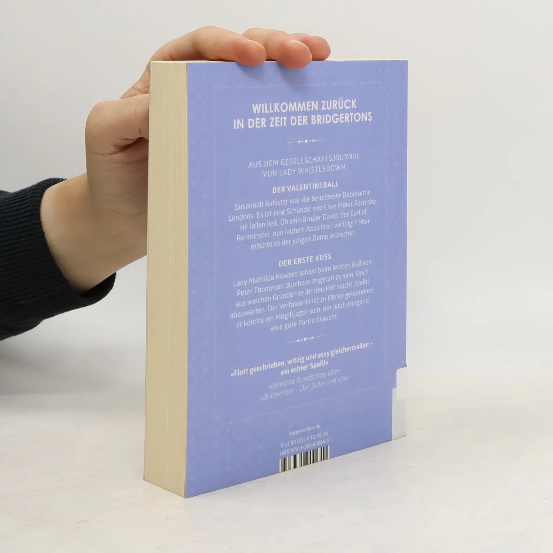 Der Valentinsball Susannah Ballister war die beliebteste Debütantin Londons. Es ist eine Schande, wie Clive Mann-Formsby sie fallen ließ. Ob sein Bruder David, der Earl of Renminster, nun lautere Absichten verfolgt? Man möchte es der jungen Dame wünschen. Der erste Kuss Lady Mathilda Howard schien beim letzten Ball von Peter Thompson durchaus angetan zu sein. Doch aus welchen Gründen er ihr den Hof macht, bleibt abzuwarten. Der Verfasserin ist zu Ohren gekommen, er könnte ein Mitgiftjäger sein, der jetzt dringend eine gute Partie braucht. Ihre Lady Whistledown, die wie immer verspricht, über die neusten Ereignisse zu berichten.