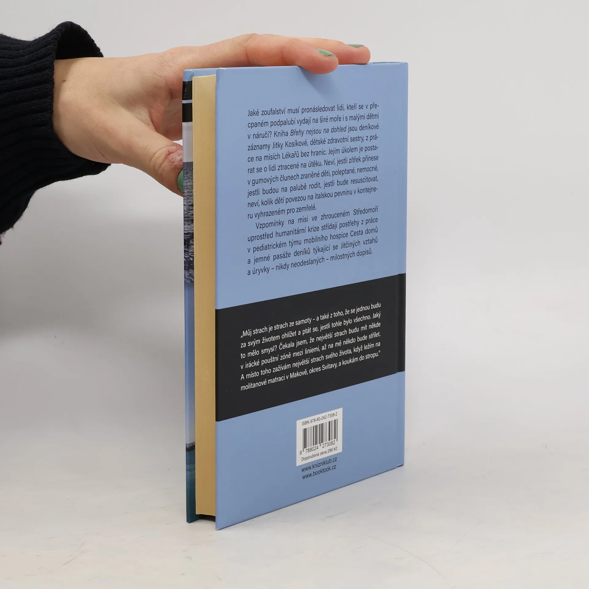 Říká se, že kdo jednou viděl zblízka smrt, dívá se už vždy na život jinak. Jitka Kosíková viděla smrt, bídu a krutost mnohokrát, v rozličných podobách. Její práce dětské sestry obnáší dělat pod časovým tlakem a ve stresujících podmínkách rozhodnutí s dlouhodobými a nevratnými následky, je na to zvyklá a přiznává, že ji to baví. Kniha Břehy nejsou na dohled jsou deníkové záznamy z práce na misích Lékařů bez hranic a v pediatrickém týmu mobilního hospice Cesta domů. Dějová linie, odehrávající se na misi ve zhrouceném Středomoří uprostřed humanitární krize, předestírá obrázek Jitky jako silné, samostatné ženy s autoritou nutnou pro práci v hostilním prostředí. Tento obrázek obrušují jemné pasáže deníků týkající se Jitčiných vztahů a úryvky – nikdy neodeslaných – dopisů. Deníkové záznamy pro vydání uspořádal a doplnil Marek Uhlíř, který funguje také jako překladatel mezi světem medicíny a čtenářem. Marek vystudoval žurnalistiku a management ve zdravotnictví, pracuje na zdravotnickém operačním středisku záchranné služby a vede výzkumný projekt na problematiku výjezdů záchranky k terminálně nemocným pacientům. V letech 2012-2018 vedl Cestu domů, kde se s Jitkou potkali.