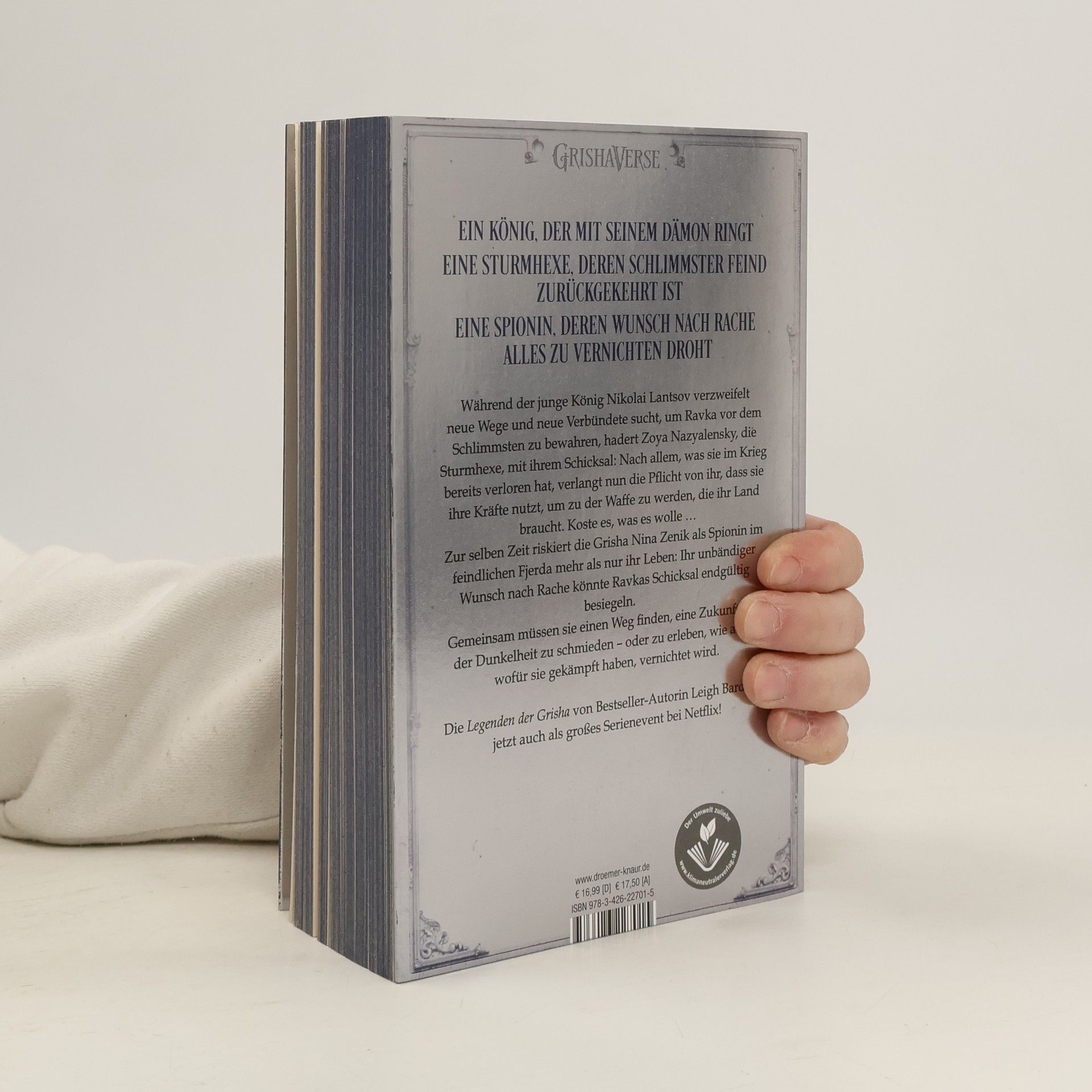 Ein König, der mit seinem Dämon ringt Eine Sturmhexe, deren schlimmster Feind zurückgekehrt ist Eine Spionin, deren Wunsch nach Rache alles zu vernichten droht Der schicksalhafte Kampf um den Zarenthron von Ravka steuert unaufhaltsam auf eine Entscheidung zu: Wird ein Krieg, den niemand gewinnen kann, eine ganz Welt in Asche versinken lassen? Während der junge König Nikolai Lantsov – auch mithilfe des Monsters in seinem Inneren – alles versucht, um Ravka vor dem Schlimmsten zu bewahren, hadert Zoya Nazyalensky, die Sturmhexe, mit ihrem Schicksal: Nach allem, was sie im Krieg bereits verloren hat, verlangt nun die Pflicht von ihr, dass sie ihre Kräfte nutzt, um die Waffe zu werden, die ihr Land braucht. Koste es, was es wolle… Zur selben Zeit riskiert die Grisha Nina Zenik als Spionin im feindlichen Fjerda mehr als nur ihr Leben: Ihr unbändiger Wunsch nach Rache könnte Ravkas Schicksal endgültig besiegeln – und Nina die Chance nehmen, ihr trauerndes Herz zu heilen…