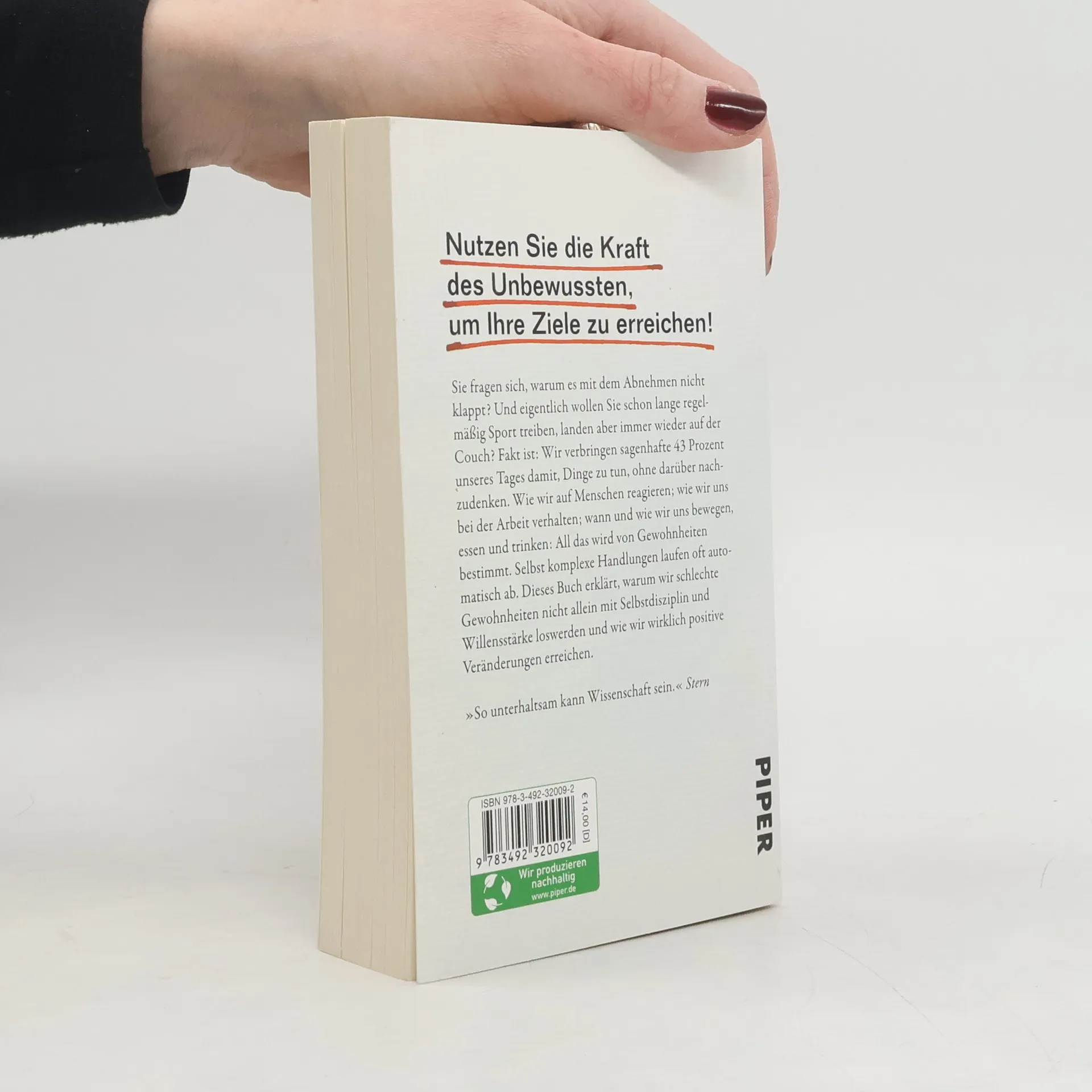 Mythos Willensstärke: warum wir nicht an mangelnder Disziplin scheitern Nutzen Sie die Kraft des Unbewussten, um Ihre Ziele zu erreichen! Sie fragen sich, warum es mit dem Abnehmen nicht klappt? Und eigentlich wollen Sie schon lange regelmäßig Sport treiben, landen aber immer wieder auf der Couch? Fakt ist: Wir verbringen sagenhafte 43 Prozent unseres Tages damit, Dinge zu tun, ohne darüber nachzudenken. Wie wir auf Menschen reagieren; wie wir uns bei der Arbeit verhalten; wann und wie wir uns bewegen, essen und trinken: All das wird von Gewohnheiten bestimmt. Selbst komplexe Handlungen laufen oft automatisch ab. Dieses Buch erklärt, warum wir schlechte Gewohnheiten nicht allein mit Selbstdisziplin und Willensstärke loswerden und wie wir wirklich positive Veränderungen erreichen. »Viele Autoren haben über Gewohnheiten geschrieben, aber Wood ist die führende Forscherin. Sie erklärt, was funktioniert und was nicht.« Washington Post »Selbst disziplinierte Menschen verdanken ihre scheinbare Tugend möglicherweise eher dem Zufall als schierer Willensstärke.« New Yorker »Faszinierend und unterhaltsam, dieses Buch wird viele Leben verändern. Es ist ein Wegweiser.« Cass R. Sunstein »Woods Arbeit hat die Wissenschaft geprägt. Ich kann mir keine bessere Person vorstellen, um dieses Buch zu schreiben.« Dan Ariely »Niemand hat besser gezeigt, wie man schlechte in gute Gewohnheiten umwandeln kann.« Robert B. Cialdini