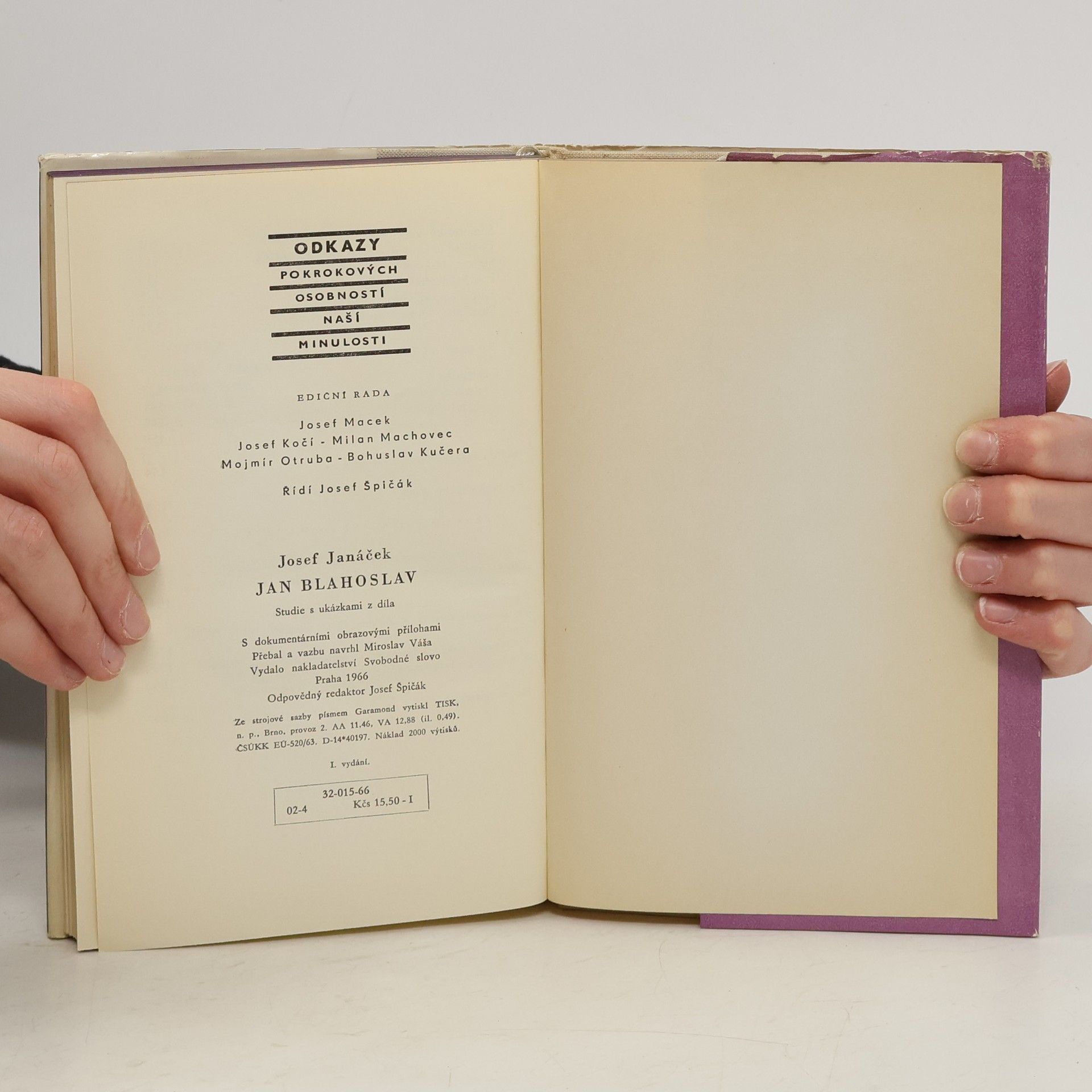 Jan Blahoslav - studie s ukázkami z díla. Další svazek edice „Odkazy pokrokových osobností naší minulosti“ přináší první pokus o rozsáhlejší zhodnocení díla významné osobnosti české kultury předbělohorské doby (1523-1571), jejíž krátký život byl vyplněn službou jednotě bratrské a oddaností humanismu. Na pozadí kulturního prostředí doby a v rámci životních osudů Blahoslavových sleduje jeho vývoj, mnohostrannou kulturní činnost a jeho statečný boj za uznání významu vzdělání. Z literárního díla uvádí ukázky z Filipiky proti misomusům, z Vad kazatelů, z Gramatiky české, z Nekrologia jednoty bratrské a ze spisu O původu jednoty bratrské a řádu v ní. 190 stran, 8 stran obrazové přílohy. 1. vydání.