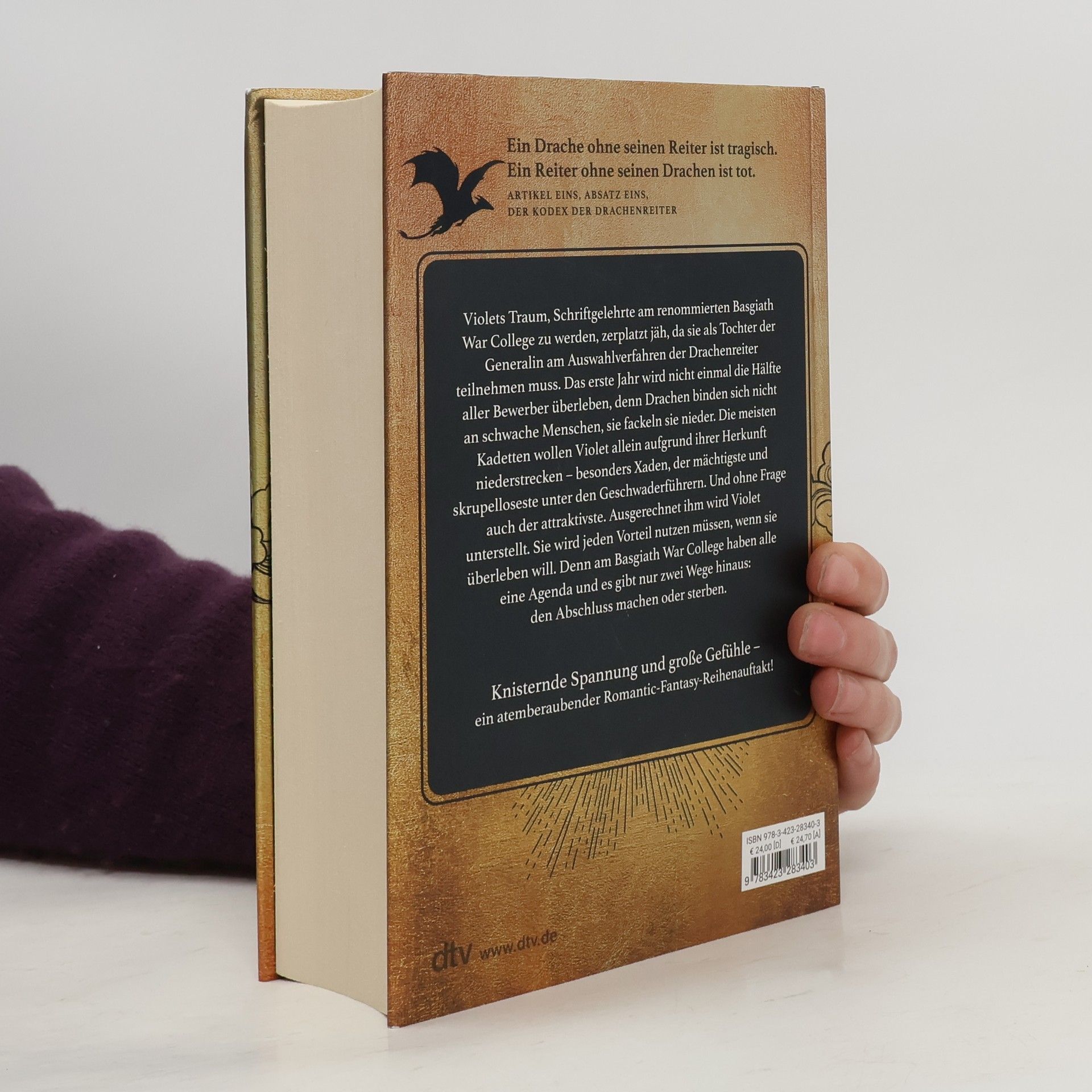 Ein Drache ohne seinen Reiter ist tragisch. Ein Reiter ohne seinen Drachen ist tot. In wunderschöner, hochwertiger Ausstattung mit aufwendig veredeltem Schutzumschlag, gestaltetem Einband und farbigen Karten im Innenteil. Knisternde Spannung und große Gefühle – ein atemberaubender Romantic-Fantasy-Reihenauftakt! Perfekt für alle Fans von Jennifer L. Armentrout, Naomi Novik und Sarah J. Maas. Violets Traum, Schriftgelehrte am renommierten Basgiath War College zu werden, zerplatzt jäh, da sie als Tochter der Generalin am Auswahlverfahren der Drachenreiter teilnehmen muss. Das erste Jahr wird nicht einmal die Hälfte aller Bewerber überleben, denn Drachen binden keine schwachen Menschen, sie fackeln sie nieder. Die meisten Kadetten wollen Violet allein aufgrund ihrer Herkunft niederstrecken – besonders Xaden, der mächtigste und skrupelloseste unter den Geschwaderführern. Und ohne Frage auch der attraktivste. Ausgerechnet ihm wird Violet unterstellt. Sie wird jeden Vorteil nutzen müssen, wenn sie überleben will. Denn am Basgiath War College haben alle eine Agenda und es gibt nur zwei Wege hinaus: den Abschluss machen oder sterben.
