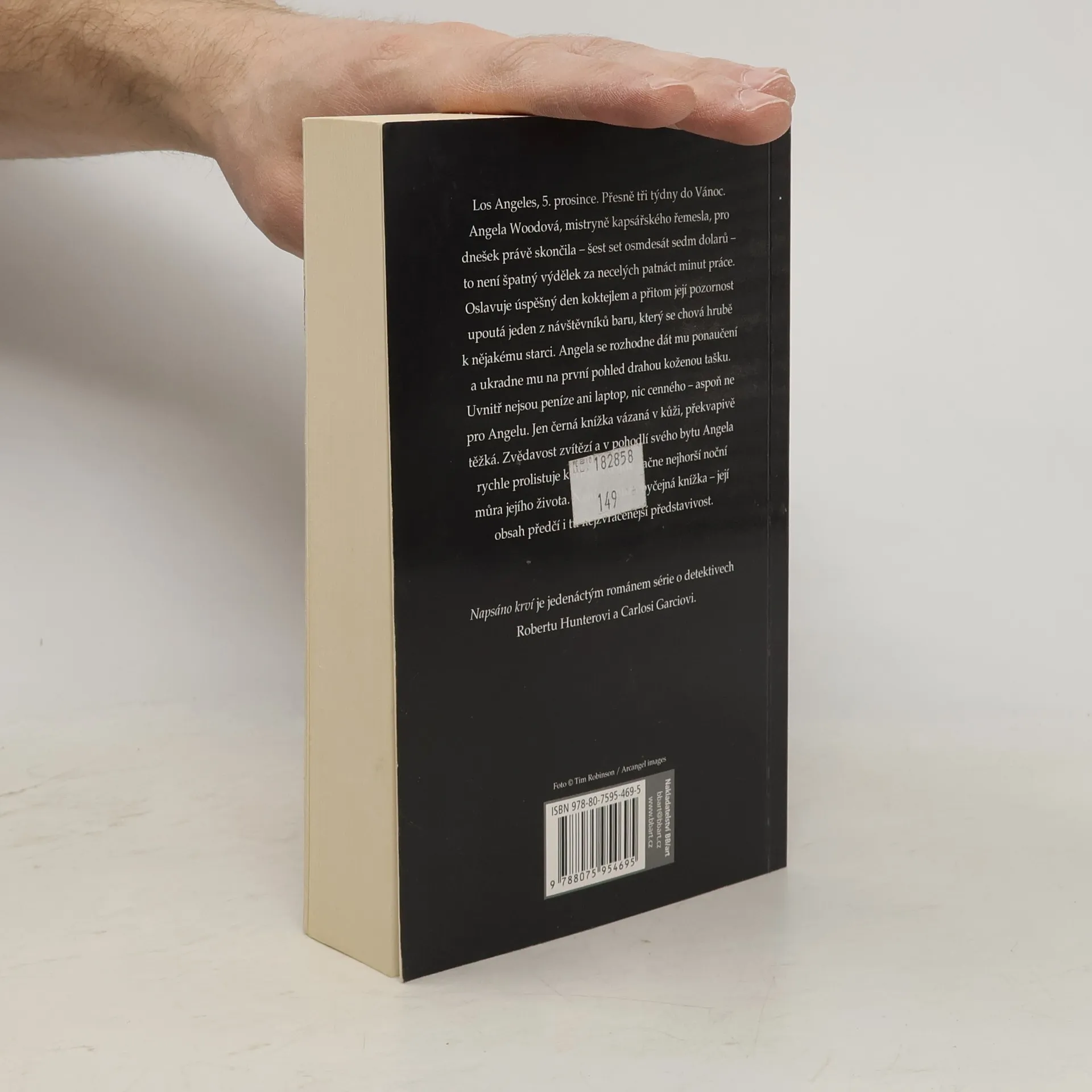 Když si napíše vaše jméno, je to rozsudek smrti… Los Angeles, 5. prosince. Přesně tři týdny do Vánoc. Angela Woodová, mistryně kapsářského řemesla, pro dnešek právě skončila – šest set osmdesát sedm dolarů – to není špatný výdělek za necelých patnáct minut práce. Oslavuje úspěšný den koktejlem a přitom její pozornost upoutá jeden z návštěvníků baru, který se chová hrubě k nějakému starci. Angela se rozhodne dát mu ponaučení a ukradne mu na první pohled drahou koženou tašku. Uvnitř nejsou peníze ani laptop, nic cenného – aspoň ne pro Angelu. Jen černá knížka vázaná v kůži, překvapivě těžká. Zvědavost zvítězí a v pohodlí svého bytu Angela rychle prolistuje kořist. A tehdy začne nejhorší noční můra jejího života. Není to totiž obyčejná knížka – její obsah předčí i tu nejzvrácenější představivost. Napsáno krví je jedenáctým románem série o detektivech Robertovi Hunterovi a Carlosi Garciovi.