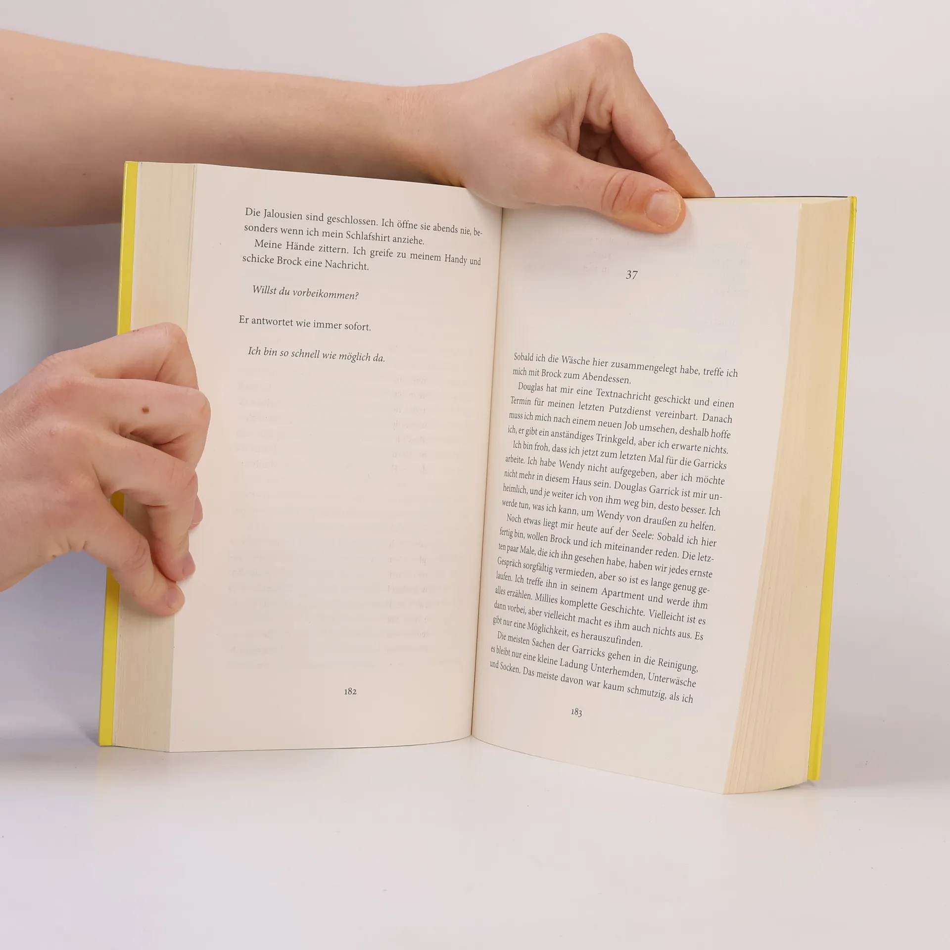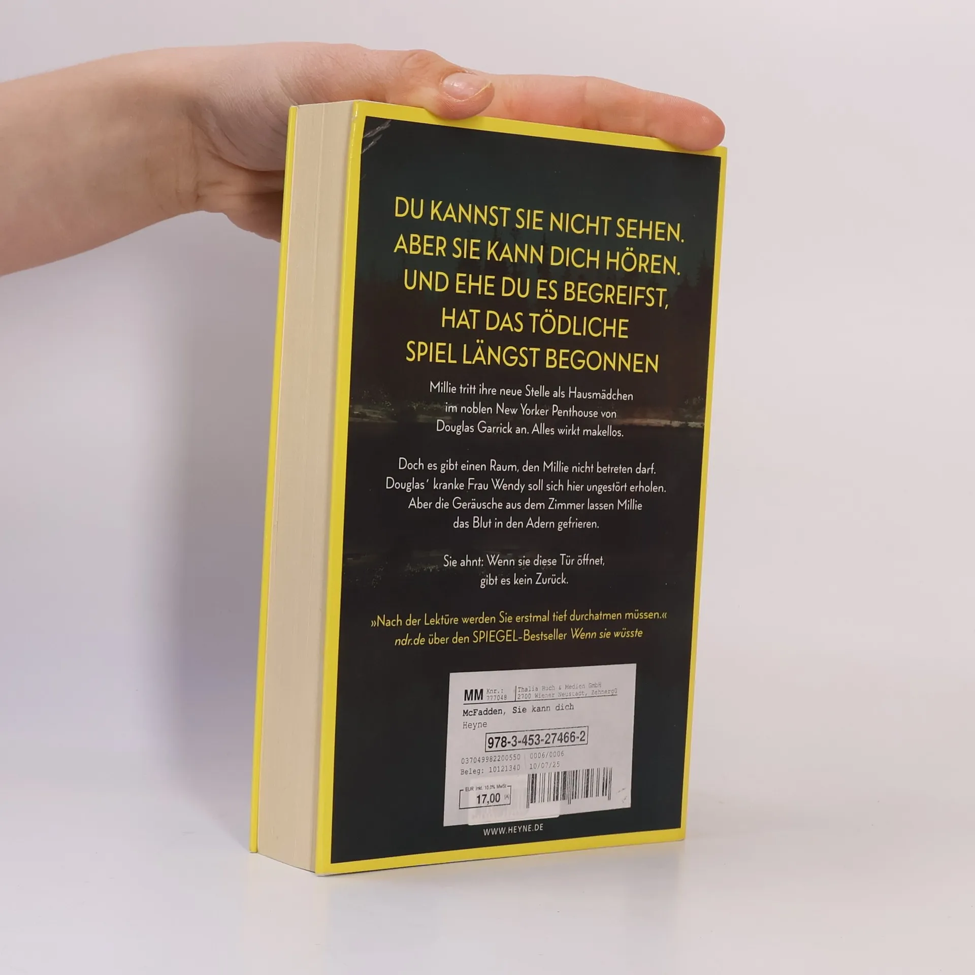 Du kannst sie nicht sehen. Aber sie kann dich hören. Und ehe du es begreifst, hat das tödliche Spiel längst begonnen Millie Calloway hat einen neuen Job. Um sich ihr Studium zu finanzieren, hilft sie einem reichen Paar aus Manhattan im Haushalt. Ihr Arbeitgeber Douglas Garrick wirkt nett, und zum Glück stellt er ihr nicht zu viele Fragen zu ihrer Vergangenheit. Doch warum darf Millie nicht mit seiner Frau Wendy sprechen? Was bedeuten das Weinen, das sie aus dem verschlossenen Zimmer hört, und die Blutflecke auf Wendys Kleidung? Ist Douglas in Wahrheit nicht der fürsorgliche Ehemann, der er vorgibt zu sein? Millie weiß nur eins: Sie muss Wendy helfen. Auch wenn sie damit riskiert, dass ihr dunkelstes Geheimnis doch noch ans Licht kommt.
