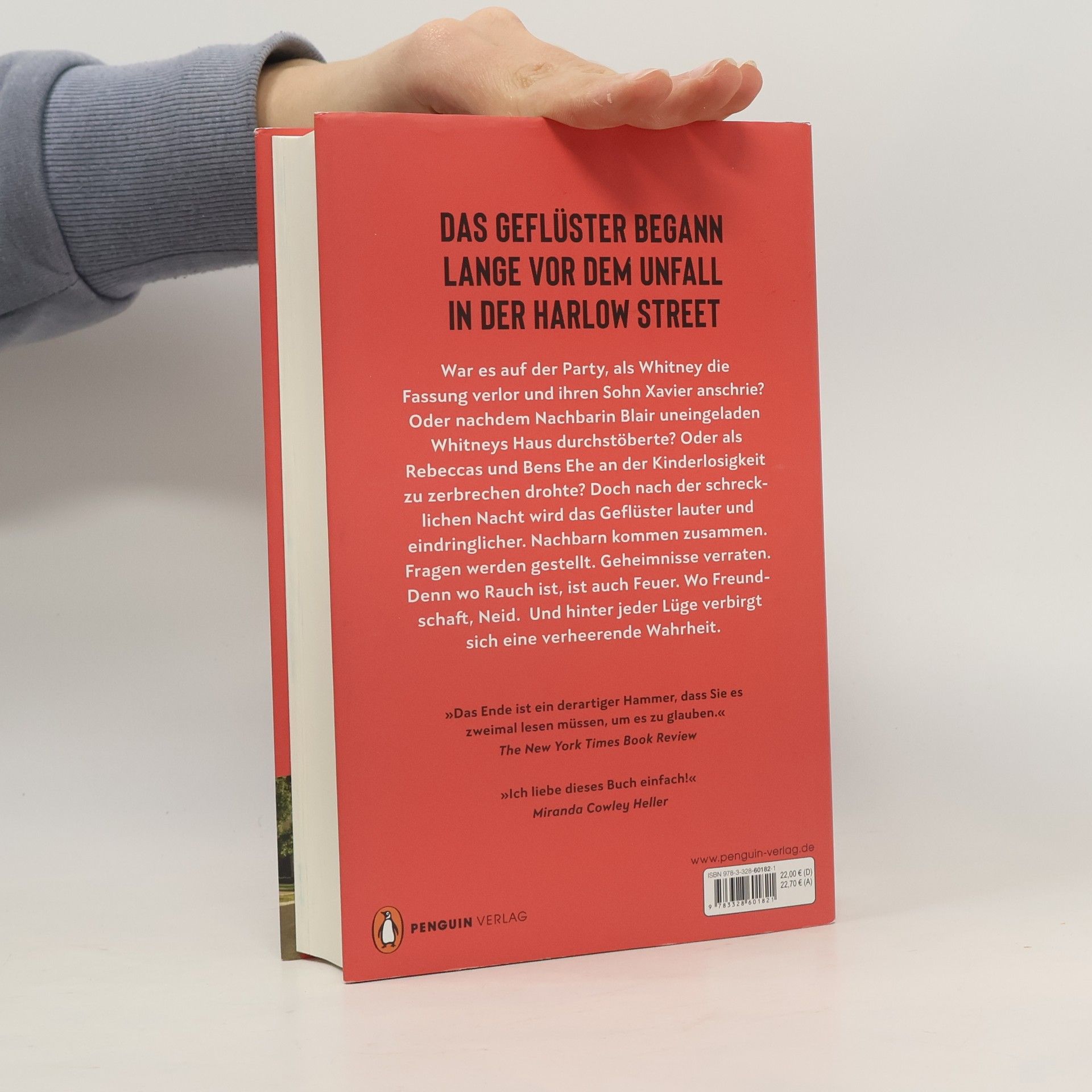 Das Geflüster begann lange vor dem Unfall in der Harlow Street. Denn wo Rauch ist, ist auch Feuer. Wo Freundschaft, Neid. Und hinter jeder Lüge verbirgt sich eine verheerende Wahrheit. Bevor der Sommer zu Ende geht, versammelt sich die Nachbarschaft der Harlow Street zu einem Gartenfest. Getränke fließen bis spät in die Nacht und alles scheint perfekt – vor allem die Gastgeberin. Bis zu dem Moment, als Whitney vor aller Augen die Fassung verliert, weil ihr neunjähriger Sohn Xavier nicht gehorchen möchte. Die emotionale Entgleisung sorgt für Getuschel hinter vorgehaltener Hand. Als Xavier nur wenige Monate später aus seinem Kinderzimmerfenster stürzt, ist der Skandal unvermeidbar und das Urteil schnell gefällt. Doch in dieser Nachbarschaft ist niemand so vollkommen, wie er vorgibt zu sein. Im Laufe einer Woche spitzen die Dinge sich zu: Während Xavier zwischen Leben und Tod schwebt, müssen sich die Frauen in der Harlow Street ihren eigenen Abgründen stellen. »Das Geflüster« ist ein mitreißenden Pageturner über vier Frauen, deren Leben sich verändert, als das Undenkbare passiert – und über das, was zerbricht, wenn gute Menschen unverzeihliche Entscheidungen treffen. »Das Ende dieses Romans ist ein derartiger Hammer, dass Sie es zweimal lesen müssen, um es zu glauben.« New York Times