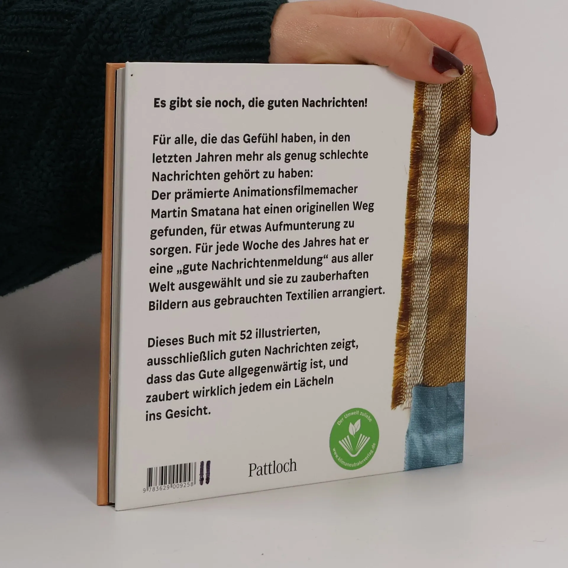 Aufmunterndes Geschenkbuch, das Zuversicht weckt 52 ausschließlich »gute Nachrichten« und Botschaften, die auf wahren Begebenheiten beruhen Zauberhaft illustriertes Buch vom prämierten Trickfilmer und Künstler Martin Smatana Kleines, liebevolles Geschenk für alle, die eine Portion Hoffnung brauchen können Geschenkbuch Aufmunterung mit 112 Seiten (Maße: 15,8 x 15,8 cm) Mit seinem rührenden Geschenkbuch zeigt der prämierte Trickfilmer und Künstler Martin Smatana, dass das Gute allgegenwärtig ist – wir müssen nur hinsehen: 52 wahre Begebenheiten aus der ganzen Welt hat Martin Smatana ausgewählt. Diese guten Nachrichten – kleine und große Gesten, die zu Herzen gehen – hat er mit Kunstwerken aus gebrauchten Stoffen illustriert, die voller Hoffnung und Poesie sind. Ein Jahr voller guter Nachrichten garantiert Woche für Woche eine bestärkende Botschaft und ist ein wunderbares Geschenk zur Aufmunterung, das in schwierigen Zeiten wie Krankheit, Verlust oder Trauer Trost schenkt, Mut gibt und Zuversicht und Hoffnung weckt.