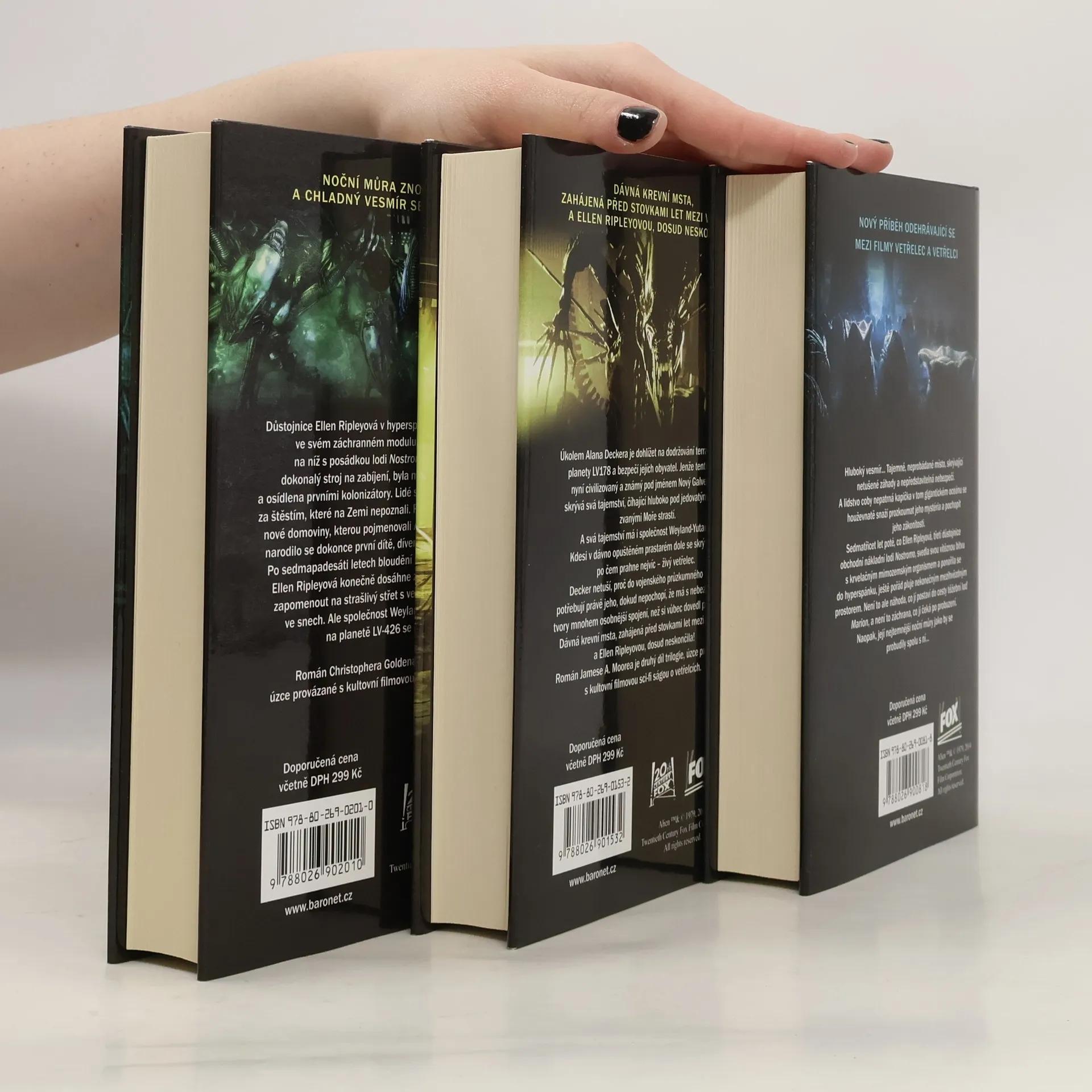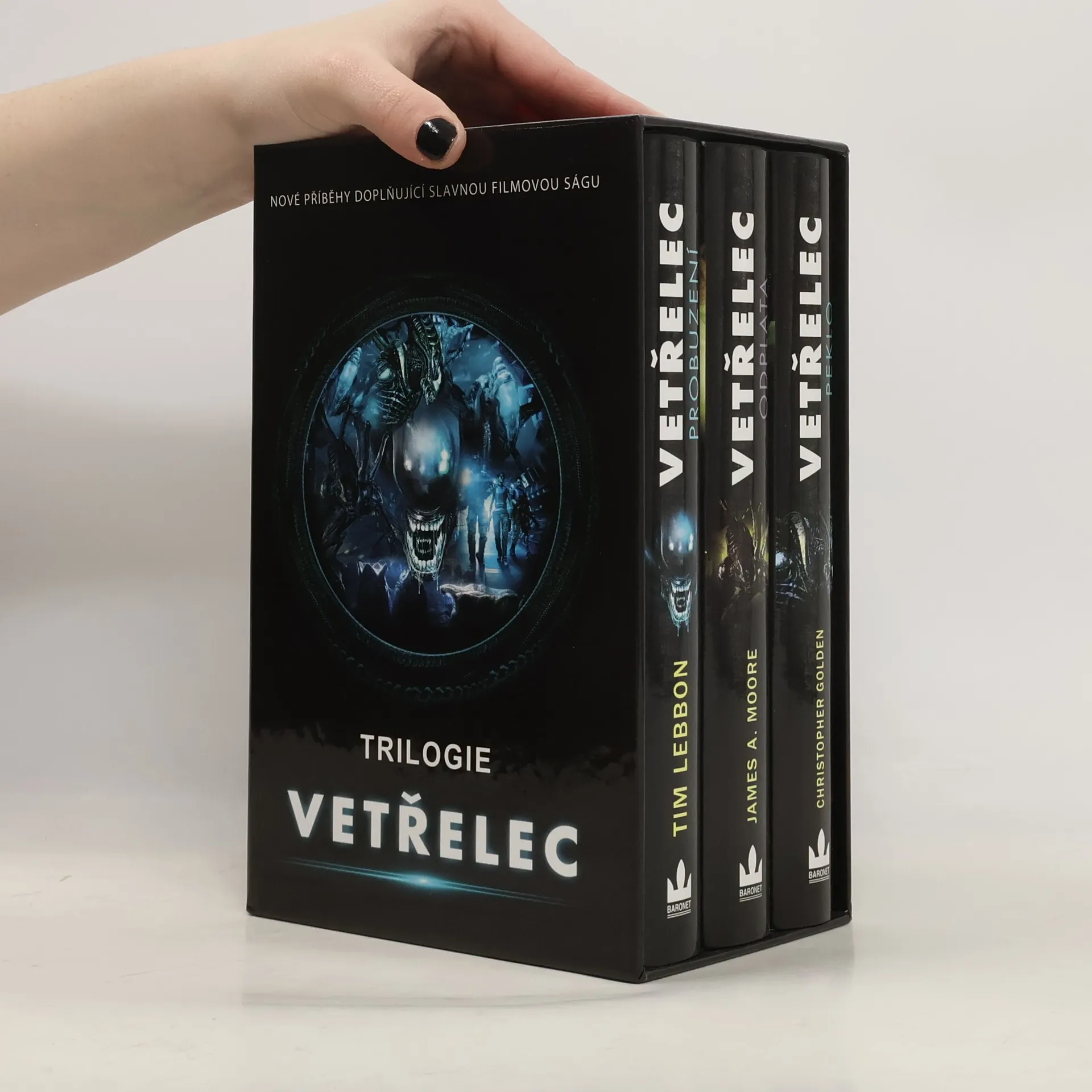 Box obsahuje následující tituly: Tim Lebbon: Vetřelec - Probuzení. V roce 2159, po vítězství Ellen Ripleyové nad vetřelcem, stále pluje v hibernačním spánku. Během těžby vzácného minerálu na planetě LV178 se objevují záhadní tvorové, a zlo se probouzí. Hlavní inženýr Chris Hooper a jeho posádka čelí zkáze, a jejich poslední nadějí je nouzový signál zachycený Elleniným záchranným modulem. Román je prvním dílem trilogie spojené s kultovní sci-fi ságou o vetřelcích. James A. Moore: Vetřelec - Odplata. Alan Decker dohlíží na terraformaci planety LV178, nyní známé jako Nový Galveston. Pod jejím povrchem se skrývá živý vetřelec a tajemství společnosti Weyland-Yutani. Decker se postupně dozvídá, že má s těmito nebezpečnými tvory osobní spojení, a krvavá msta mezi vetřelci a Ellen Ripleyovou stále pokračuje. Tento román je druhým dílem trilogie. Christopher Golden: Vetřelec - Peklo. Ellen Ripleyová pluje ve svém záchranném modulu a planeta LV-426 byla terraformována a osídlena. Kolonizátoři hledají nový život, ale na planetě se začínají dít podivné věci. Po sedmapadesáti letech bloudění se Ellen konečně dostává k záchraně, ale Weyland-Yutani ji potřebuje, protože na LV-426 se stalo něco závažného. Tento román je třetím dílem trilogie.