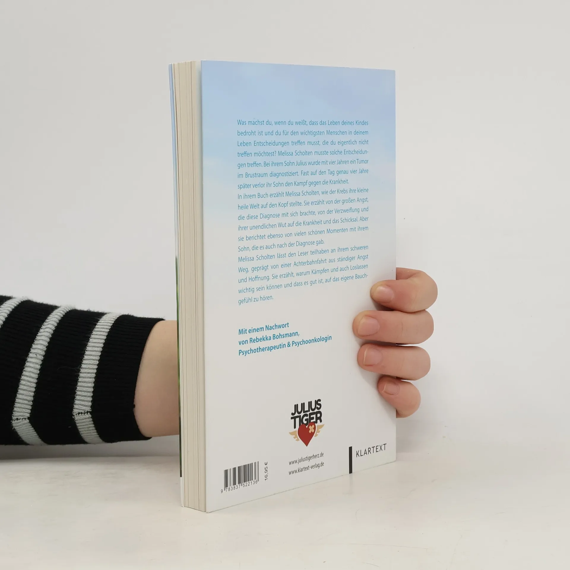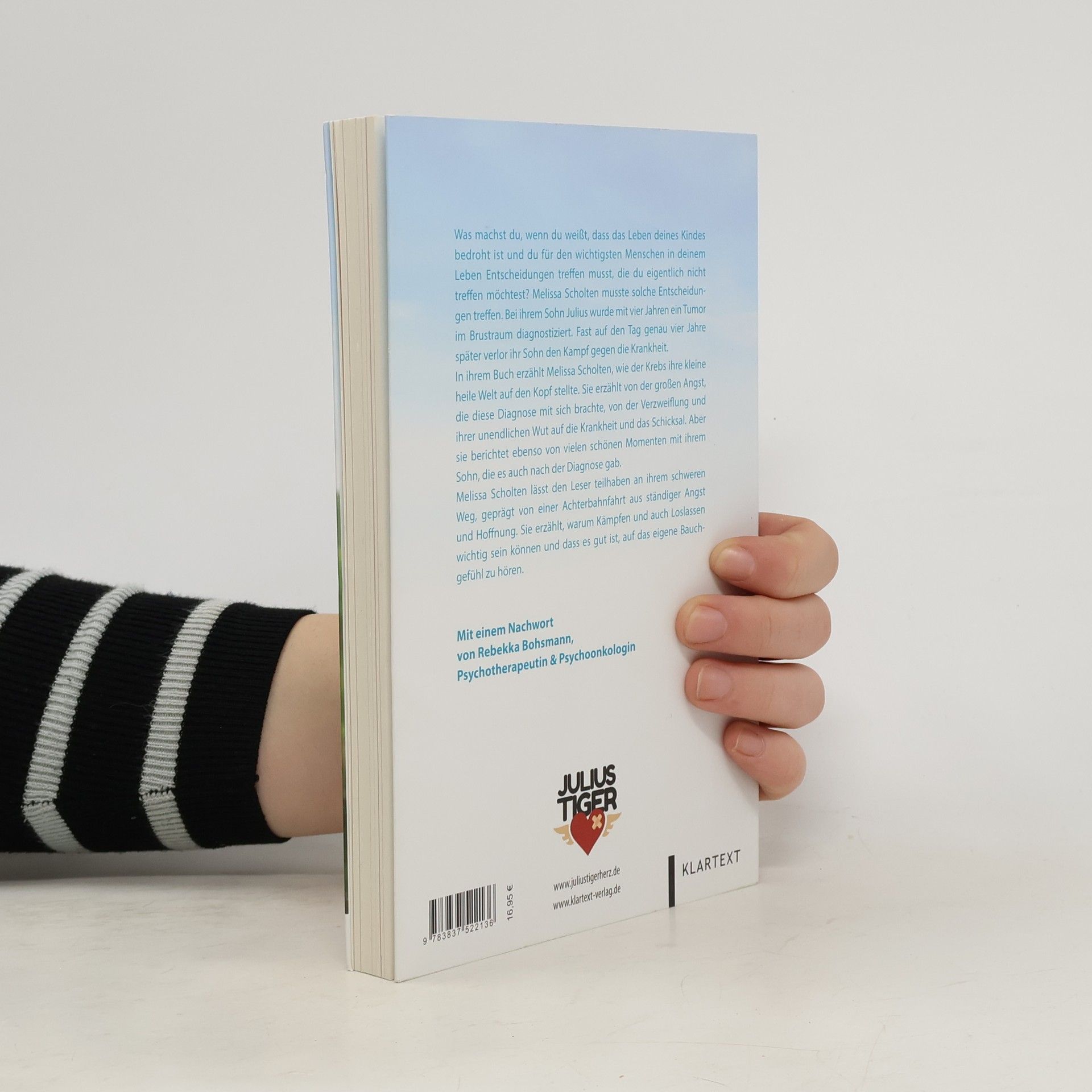 Wozu entschließt du dich, wenn das Leben deines Kindes bedroht ist und du Entscheidungen treffen musst, die du eigentlich nicht treffen möchtest? Melissa Scholten musste solche Entscheidungen treffen. Bei ihrem Sohn Julius wurde mit vier Jahren ein Tumor im Brustraum diagnostiziert. Fast auf den Tag genau vier Jahre später verlor ihr Sohn den Kampf gegen die Krankheit. In ihrem Buch erzählt Melissa Scholten, wie der Krebs ihre kleine heile Welt auf den Kopf stellte. Sie erzählt von der großen Angst, die diese Diagnose mit sich bringt, von der Verzweiflung und ihrer unendlichen Wut auf die Krankheit und das Schicksal. Aber sie berichtet auch von vielen schönen Momenten mit ihrem Sohn, die es auch nach der Diagnose gab. Melissa Scholten lässt den Leser teilhaben an ihrem schweren Weg, geprägt von einer Achterbahnfahrt aus ständiger Angst und Hoffnung.