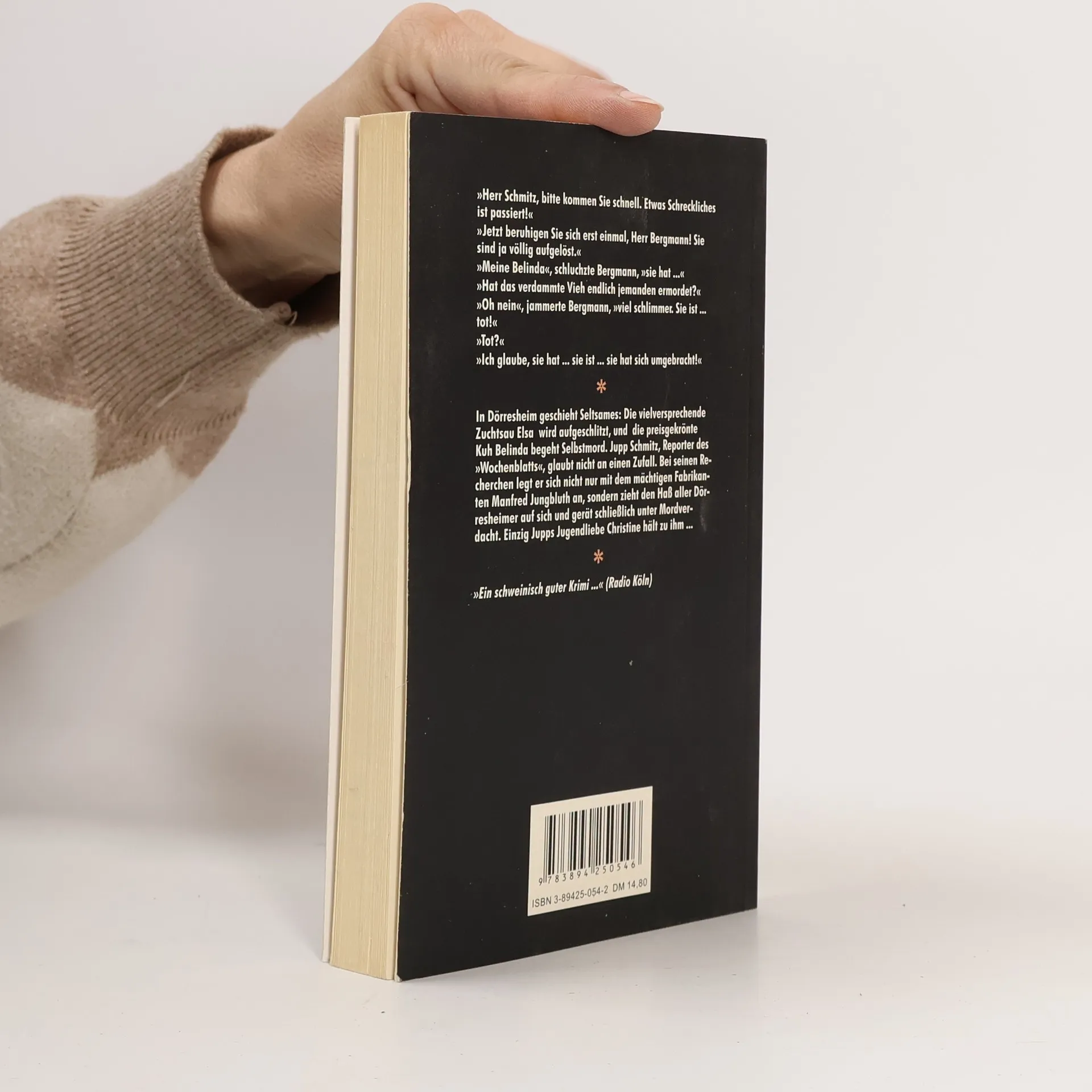 Hätte Jupp Schmitz gewußt, in was für einen Schlamassel er geraten würde, als er beschloß, den seltsamen Toden der Zuchtsau Elsa und der preisgekrönten Kuh Belinda nachzugehen, wäre er wohl an diesem Morgen im Bett liegengeblieben. Zumal er sich weder für fette, aufgeschlitzte Schweine noch für selbstmörderische Kühe interessierte. Schon eher für Dr. Mark Banning, einen zugereisten Veterinär, der mit Jupps Jugendliebe Christine Jungbluth verlobt ist. „. eine Geschichte mit haarsträubenden Bildern, urkomischen Szenen und seltsamen Typen. Eine Geschichte voll ernster Inhalte, menschlicher Schwächen und echter Freundschaft.“ (Blickpunkt)