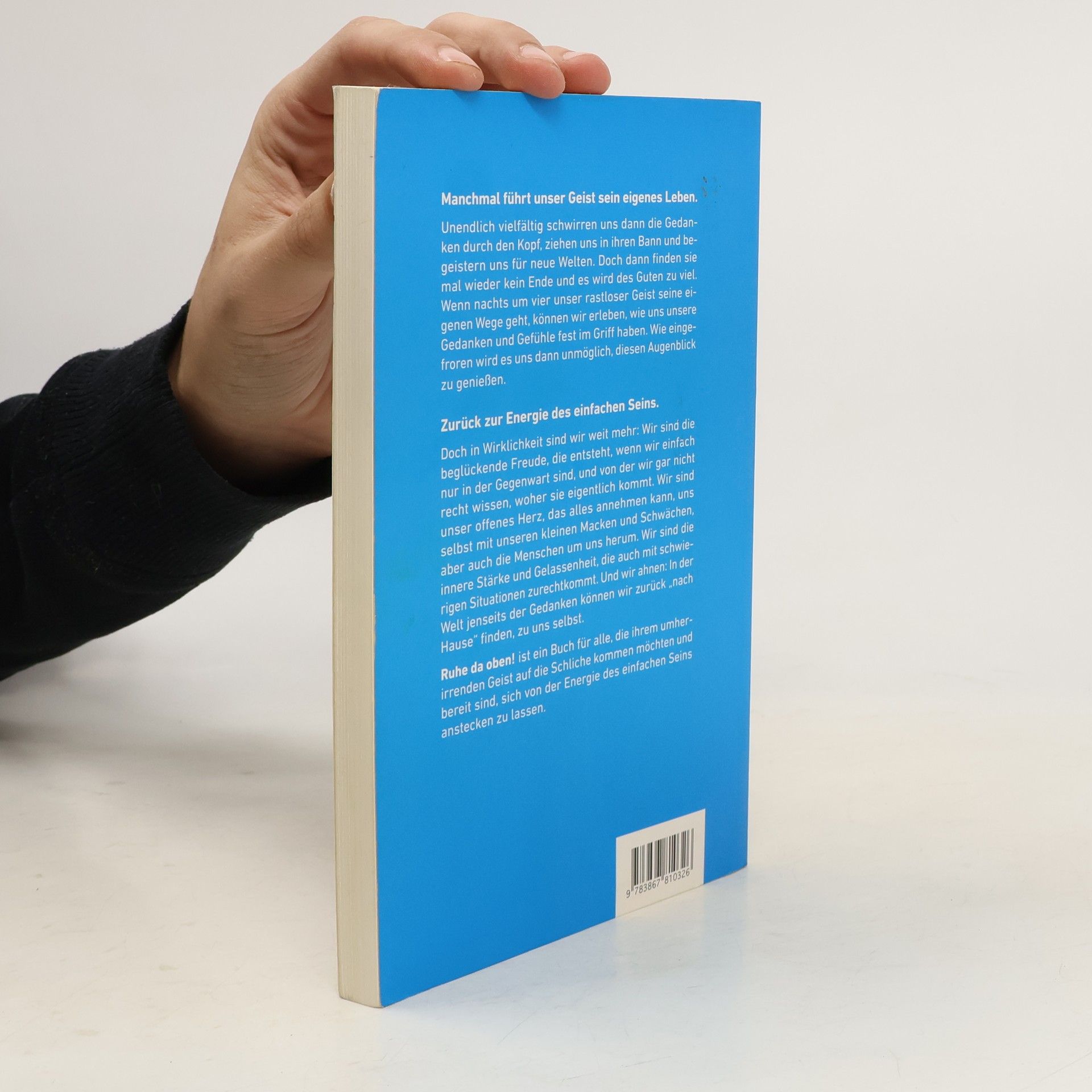 Ruhe da oben! ist ein Buch für alle, die ihrem umherirrenden Geist auf die Schliche kommen möchten und bereit sind, sich von der Energie des einfachen Seins anstecken zu lassen. Manchmal führt unser Geist sein eigenes Leben. Unendlich vielfältig schwirren uns dann die Gedanken durch den Kopf, ziehen uns in ihren Bann und begeistern uns für neue Welten. Doch dann finden sie mal wieder kein Ende und es wird des Guten zu viel. Wenn nachts um vier unser rastloser Geist seine eigenen Wege geht, können wir erleben, wie uns unsere Gedanken und Gefühle fest im Griff haben. Wie eingefroren wird es uns dann unmöglich, diesen Augenblick zu genießen. Zurück zur Energie des einfachen Seins. Doch in Wirklichkeit sind wir weit mehr: Wir sind die beglückende Freude, die entsteht, wenn wir einfach nur in der Gegenwart sind, und von der wir gar nicht recht wissen, woher sie eigentlich kommt. Wir sind unser offenes Herz, das alles annehmen kann, uns selbst mit unseren kleinen Macken und Schwächen, aber auch die Menschen um uns herum. Wir sind die innere Stärke und Gelassenheit, die auch mit schwierigen Situationen zurechtkommt. Und wir ahnen: In der Welt jenseits der Gedanken können wir zurück „nach Hause“ finden, zu uns selbst.