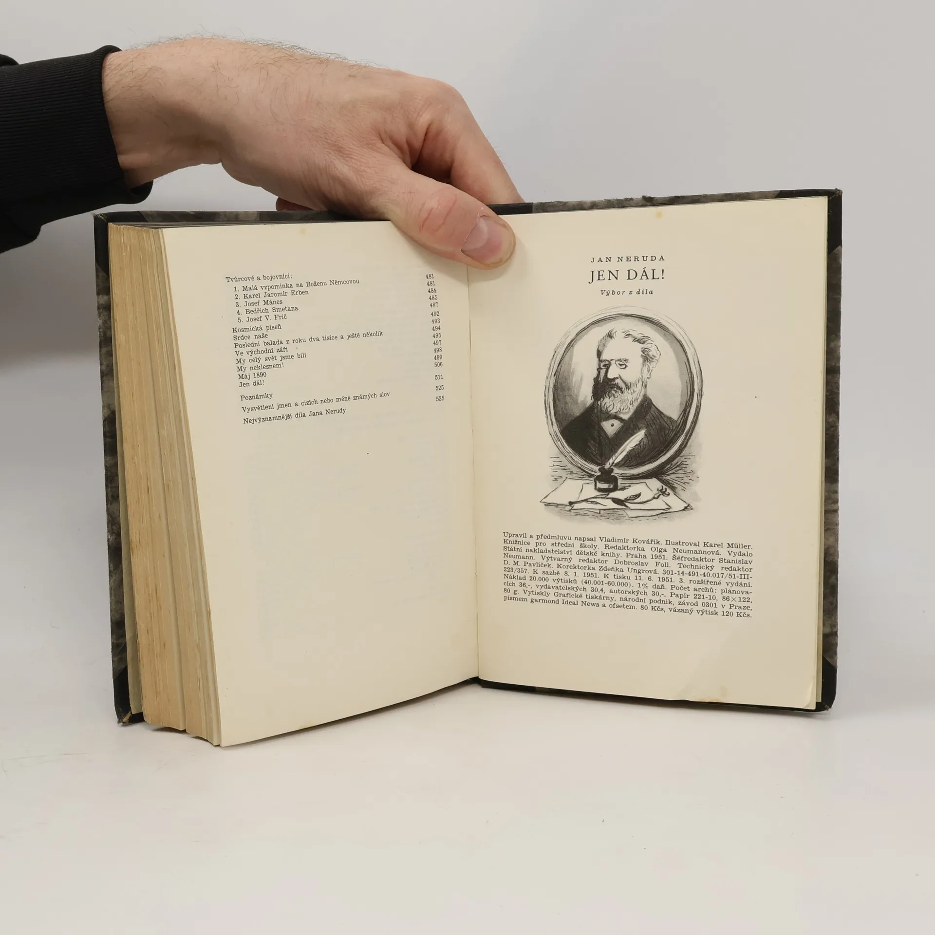 Neruda, "náš největší básník, vidící ještě i daleko přes nás do budoucnosti" (J. Fučík, Reportáž psaná na oprátce), Neruda, jehož básnickým credem bylo: "Studovat český lid, nechť na venkově, nechť v městě, toť úkol našeho spisovatele!" Neruda, bojovník za pravdu, pokrok, svobodu národa a celého lidstva, mluví k nám ze všech básní, feuilletonů a povídek výboru, který je ve svém 3. vyd. značně rozšířen a rozhojněn o mnohé další ukázky, charakterisující Nerudovo dílo a život, dobu ve které básník žil. Od vzpomínek na proletářské dětství malostranského chlapce (část I.: Mne osud do kolébky tvrdé dal) přes povídky, feuilletony a básně o utrpení a bídě lidu (část II.: Zpívám o chudobě), Písně kosmické, Balady a romance, Prosté motivy (ukázky z těchto sbírek v III. části: Volím slovo prosté) až k boji za práva lidu (část IV.: Za národ i lidstvo celé - ukázky ze Zpěvů pátečních, arabesek, studií a portrétů, povídek a slavný feuilleton Máj 1890, v němž se Neruda tak nekompromisně postavil do řad dělnictva, bojujícího za svá práva), poznáváme v knize tohoto velkého básníka, novináře, spisovatele a bojovníka.