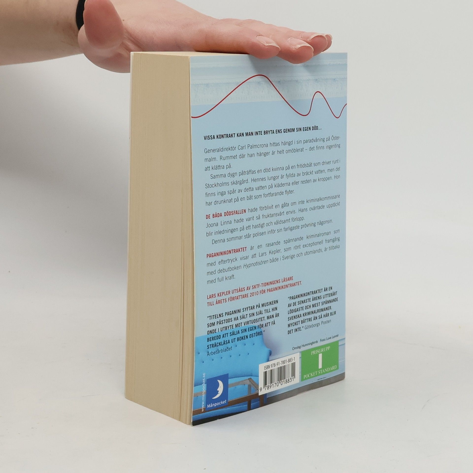 En sommarnatt hittas en kvinna död på en stor fritidsbåt som driver runt i Stockholms skärgård. Hennes lungor är fyllda av bräckt vatten, men det finns inga spår av detta vatten på kläderna eller resten av kroppen. - Hon har drunknat, Joona, säger Nålen. - Drunknat? Nålen nickar och ler vibrerande. - Hon har drunknat ombord på en båt som flyter, säger han. - Antagligen har någon hittat henne i vattnet och lyft ombord henne. - Ja, men om jag trodde det så hade jag inte tagit upp din tid, säger Nålen. Nästa dag hittas en man död i sin paradvåning på Östermalm. Mannen hänger i en snara från lampkroken i taket. Hur har det gått till? Det är högt i tak och det finns inte en enda möbel i hela rummet, ingenting att klättra på. Trots det är kommissarie Joona Linna övertygad om att det rör sig om självmord. Han har givetvis rätt. Mannen har tagit sitt eget liv, men självmordet avslutar inte fallet, utan blir istället upptakten till ett hisnande intensivt och farligt förlopp. Vissa kontrakt kan man inte bryta ens genom sin egen död. Paganinikontraktet är pseudonymen Lars Keplers nya bok efter den massiva succén med debuten Hypnotisören.