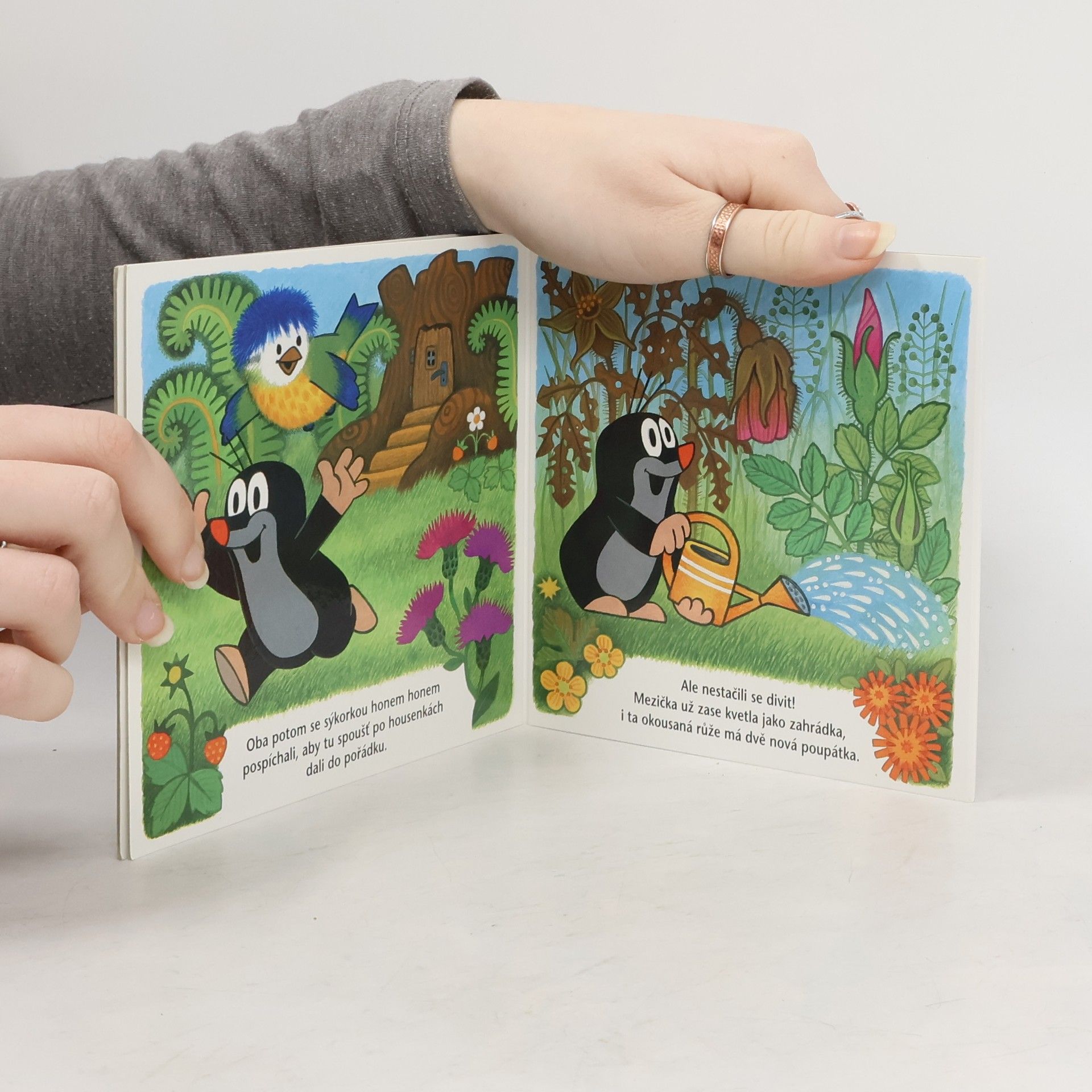Krtek a malá sýkorka se stali nerozlučnými kamarády. V létě se radují ze zahrádky, ošetřují rostlinky, zalévají a mají radost, že zahrádka pěkně rozkvetla. Šťavnaté listy rostlinek ale náramně zachutnaly třem tlustým housenkám, a kdyby nebylo Krtka, všechno zelené bydočista okousaly a ze zahrádky by nezbylo nic. Jak si s nimi poradí, a jak to nakonec dopadne? Leporelo