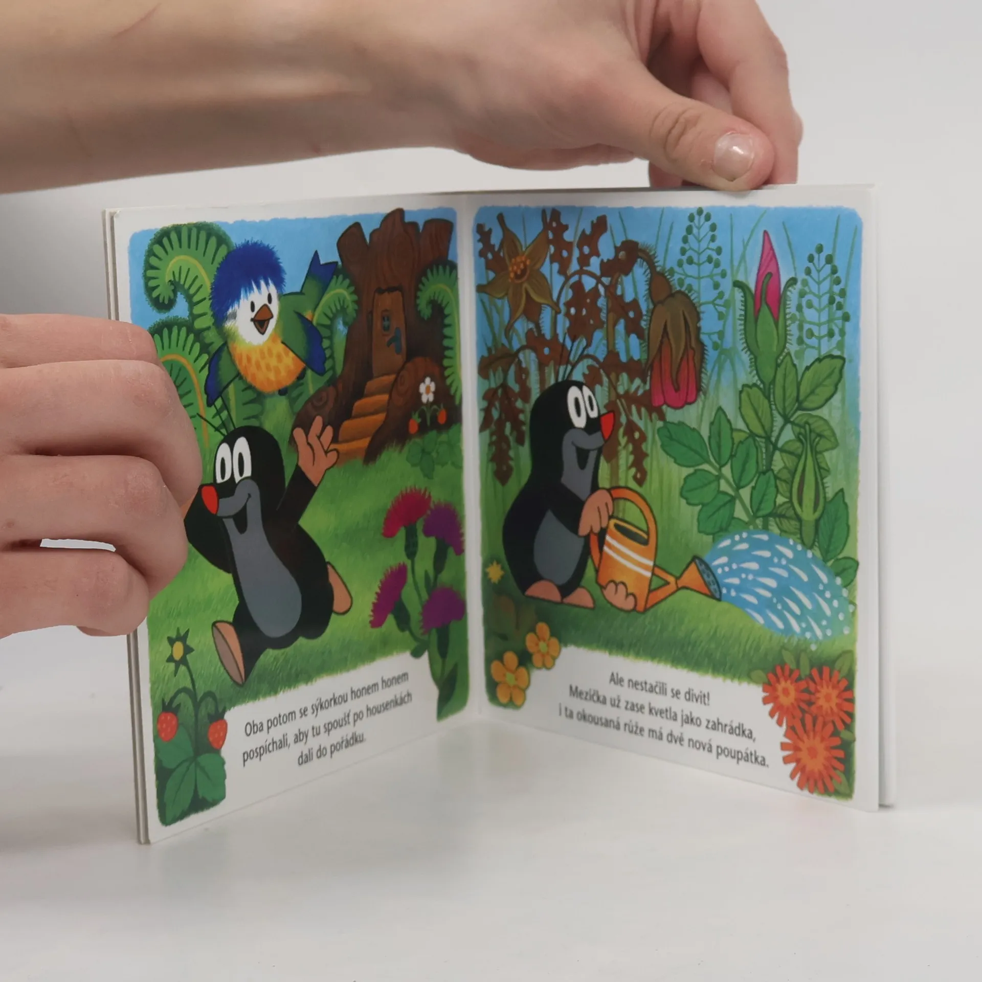 Krtek a malá sýkorka se stali nerozlučnými kamarády. V létě se radují ze zahrádky, ošetřují rostlinky, zalévají a mají radost, že zahrádka pěkně rozkvetla. Nestarají se však sami. Šťavnaté listy také náramně zachutnaly třem tlustým housenkám, a kdyby nebylo Krtka, všechno zelené by dočista okousaly a ze zahrádky by nezbylo nic. Jak si s nimi poradí, a jak to nakonec dopadne, si děti prohlédnou v leporelu Krtek a léto.