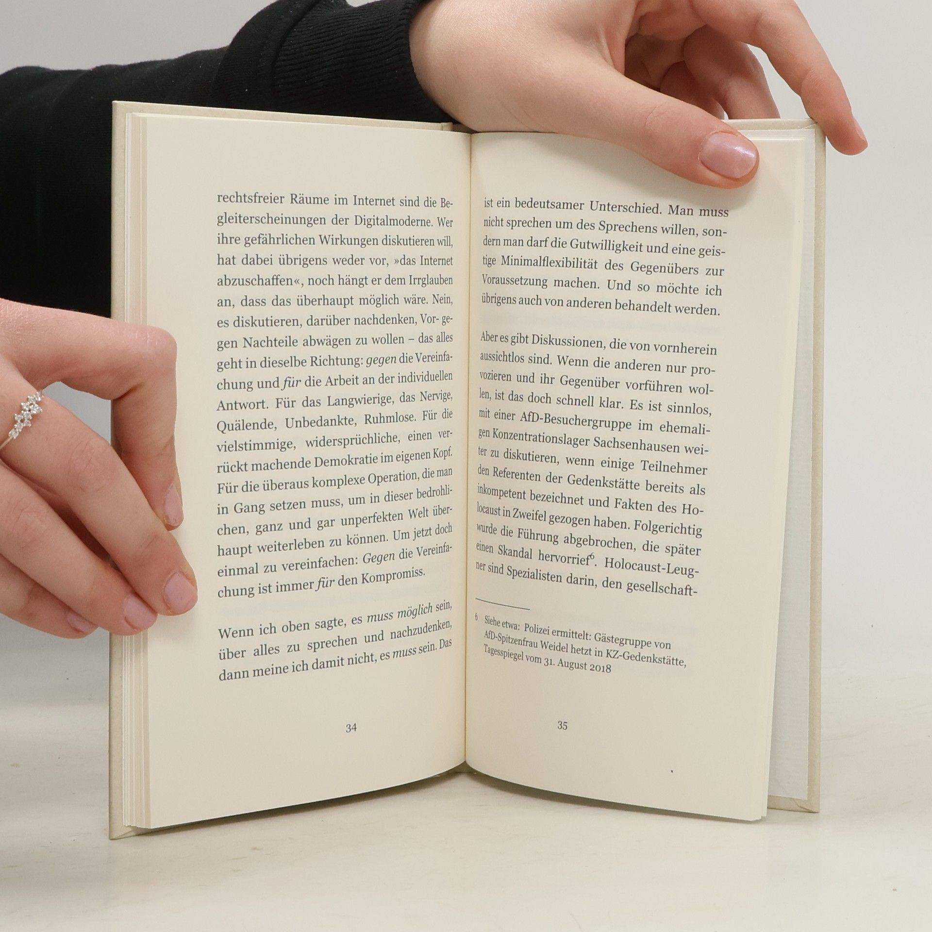 »Kompromisse werden langsam und unter Schmerzen geboren. Sie erwachsen aus einer Zusammenarbeit, gegen die sich erst einmal jeder sträubt« – so einfach ist es, einen komplizierten Prozess zu beschreiben. Mit einer behänden Leichtigkeit schafft es die begnadete Essayistin Eva Menasse, zeitdiagnostisch Kernprobleme unserer Gegenwart in den Blick zu nehmen. Gesellschaftspolitisch bedeutsam sind ihre Gedankenspiele in einer Zeit von Fremdenfeindlichkeit, Rassismus, dem Erstarken autoritärer Politiker, Fake News, Aluhutträgern – denn wie all jenen begegnen? Ansichten als Hirngespinste abtun? Den Dialog verweigern? Oder auf sie zugehen und diskutieren, in der Hoffnung Denkräume zu öffnen? Menasse schreibt über Dinge, die uns alle angehen und über die wir weiterdenken sollten, um etwas gegen eine Verrohung der Gesellschaft zu tun. „Die vielgerühmte Freiheit, dass sich jeder zu allem äußern kann, schafft die gefährliche Illusion, dass das Aushalten anderer Meinungen nicht mehr nötig ist. Es war schon immer schwer, Kindern zu erklären, dass es keine garantierte Gerechtigkeit gibt, sondern dass man nur beständig an ihr arbeiten kann. Heute ist es schwer, Erwachsenen zu erklären, was ein Kompromiss ist und wozu man ihn braucht. Andere Meinungen dienen nicht mehr dazu, unsere eigenen zu überprüfen – sondern den Gegner zu markieren.“