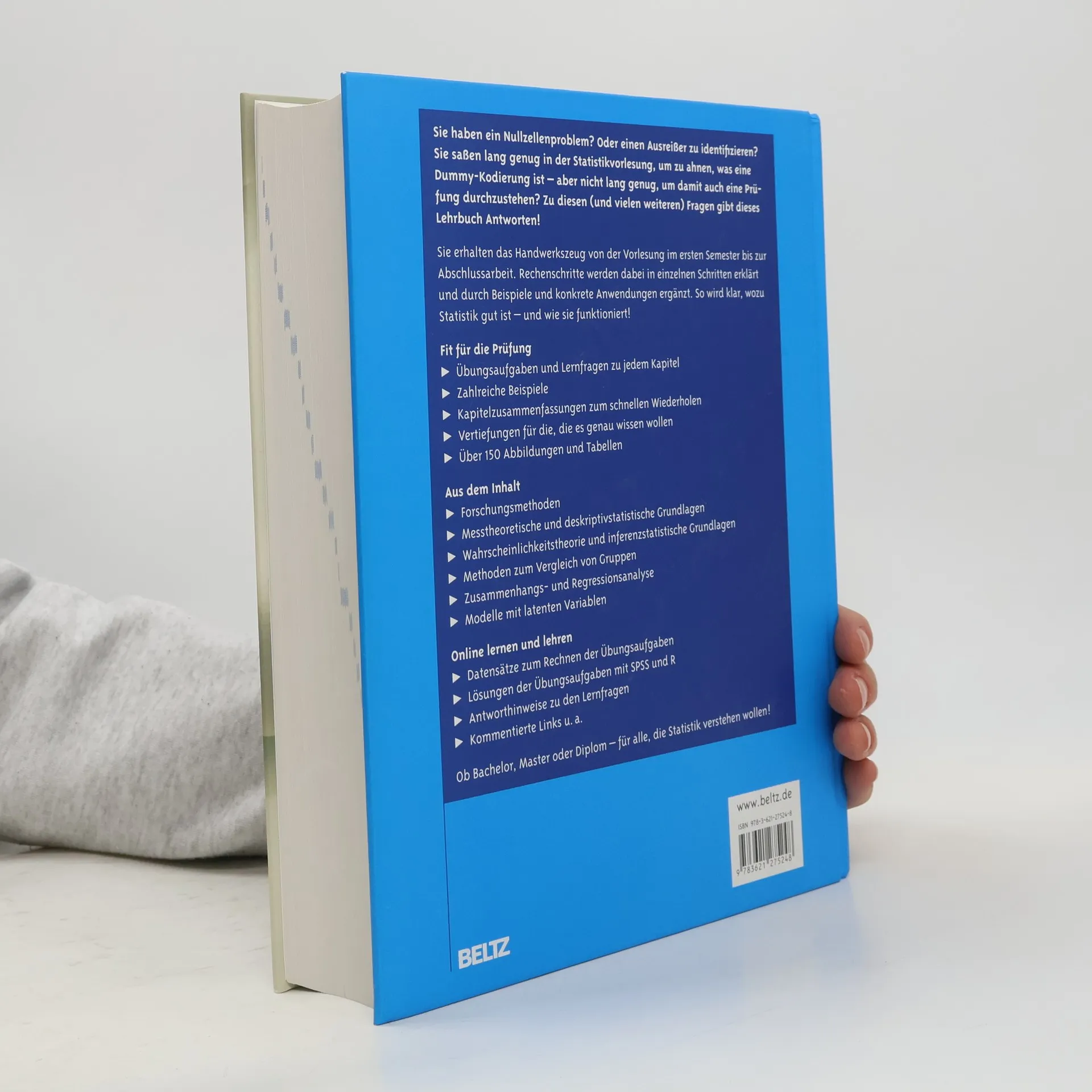 Statistik und Forschungsmethoden zählen nicht zu den beliebtesten Fächern in der Psychologie, zu groß ist der Respekt vor ihnen. Jetzt liegt ein Lehrbuch vor, das Abhilfe schafft – anschaulich und nachvollziehbar werden die statistischen Verfahren dargestellt. Dabei sind viele Formeln notwendig, Rechenschritte werden aber immer in einzelnen Schritten erläutert und durch Beispiele und konkrete Anwendungen ergänzt. So leuchtet dem Leser ein, wozu Statistik gut ist – und wie sie funktioniert! Aus dem Inhalt • Forschungsmethoden • Messtheoretische und deskriptivstatistische Grundlagen • Wahrscheinlichkeitstheorie und inferenzstatistische Grundlagen • Methoden zum Vergleich von Gruppen • Zusammenhangs- und Regressionsanalyse • Modelle mit latenten Variablen Mit Online-Materialien: Kommentierte Links zu im Internet frei verfügbaren Computerprogrammen und Tabellen Lösungen der Übungsaufgaben Datensätze zum Selbst-Nachrechnen Häufig gestellte Fragen Neuigkeiten