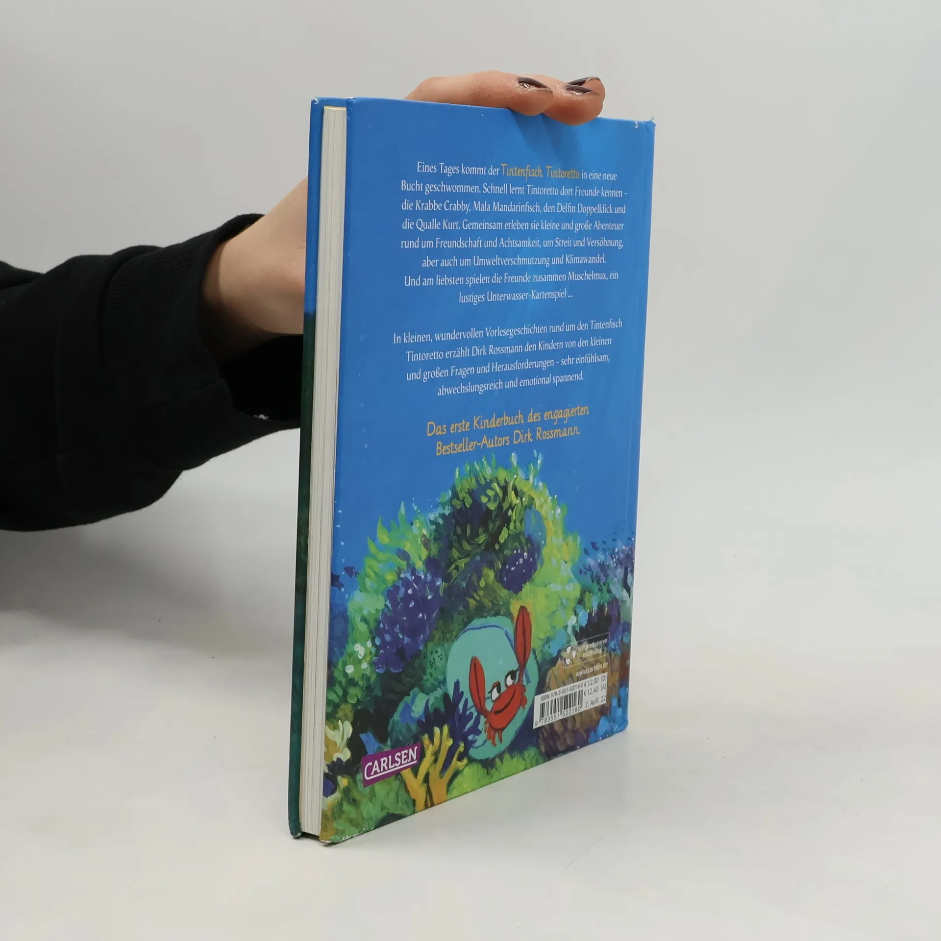 Der Tintenfisch Tintoretto kommt neu in die Bucht und lernt dort Crabby Krabbe, Mala Mandarinfisch, den Delfin Doppelklick und die Qualle Kurt kennen. Gemeinsam macht das Leben im Ozean noch mehr Spaß. Die Freunde erleben Abenteuer, helfen sich aber auch gegenseitig aus der Patsche und kämpfen gegen die Umweltverschmutzung. In Vorlesegeschichten rund um einen Tintenfisch erzählt Dirk Rossmann den Kindern von den kleinen und großen Fragen und Herausforderungen, einfühlsam, abwechslungsreich und emotional spannend. Das erste Kinderbuch des engagierten Bestseller-Autors!