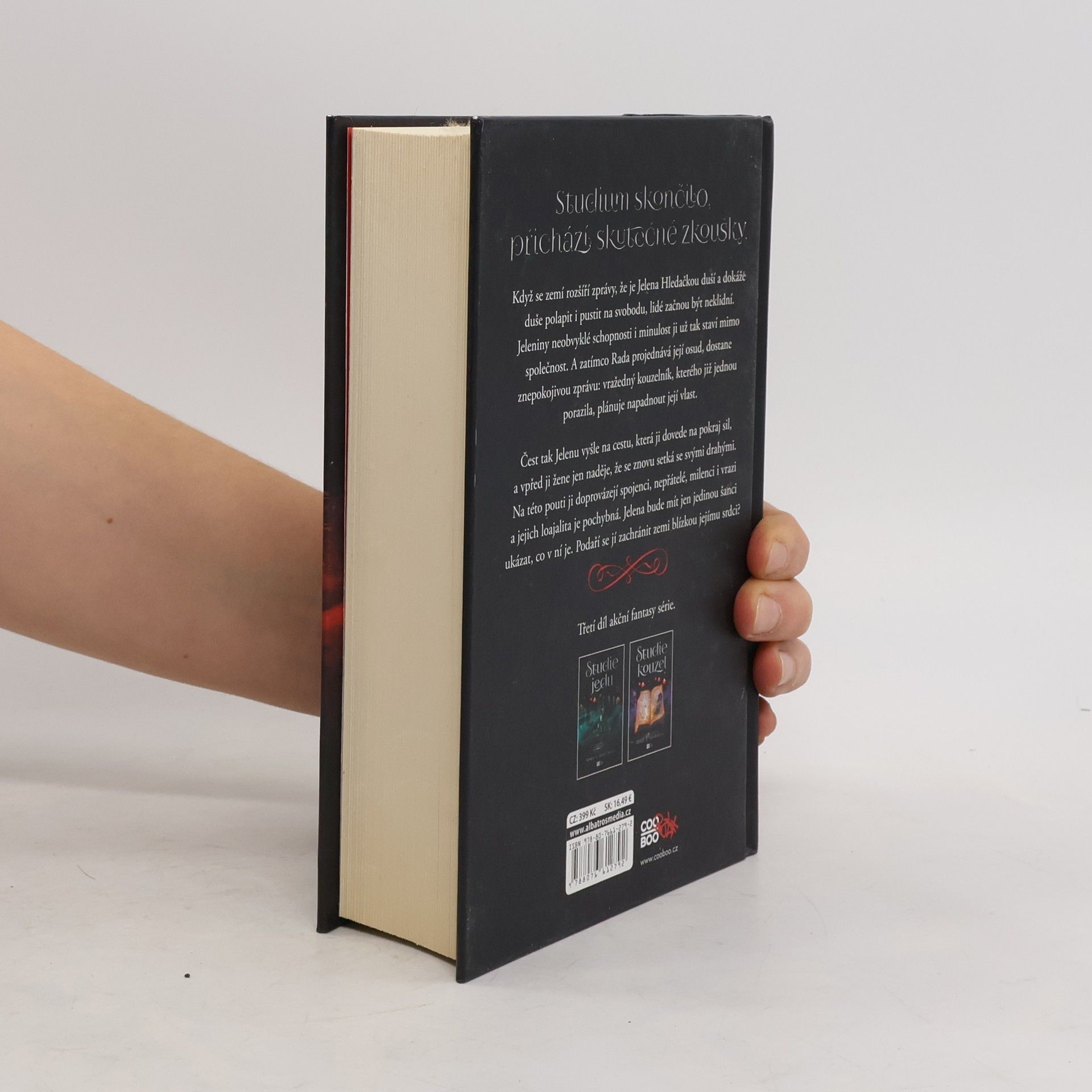 Studium skončilo, přichází skutečné zkoušky. Třetí díl akční fantasy série. Když se zemí rozšíří zprávy, že je Jelena Hledačkou duší a dokáže duše polapit i pustit na svobodu, lidé začnou být neklidní. Jeleniny neobvyklé schopnosti i minulost ji už tak staví mimo společnost. A zatímco Rada projednává její osud, dostane znepokojivou zprávu: vražedný kouzelník, kterého již jednou porazila, plánuje napadnout její vlast. Čest tak Jelenu vyšle na cestu, která ji dovede na pokraj sil, a vpřed ji žene jen naděje, že se znovu setká se svými drahými. Na této pouti ji doprovázejí spojenci, nepřátelé, milenci i vrazi a jejich loajalita je pochybná. Jelena bude mít jen jedinou šanci ukázat, co v ní je - a zachránit zemi blízkou jejímu srdci.
