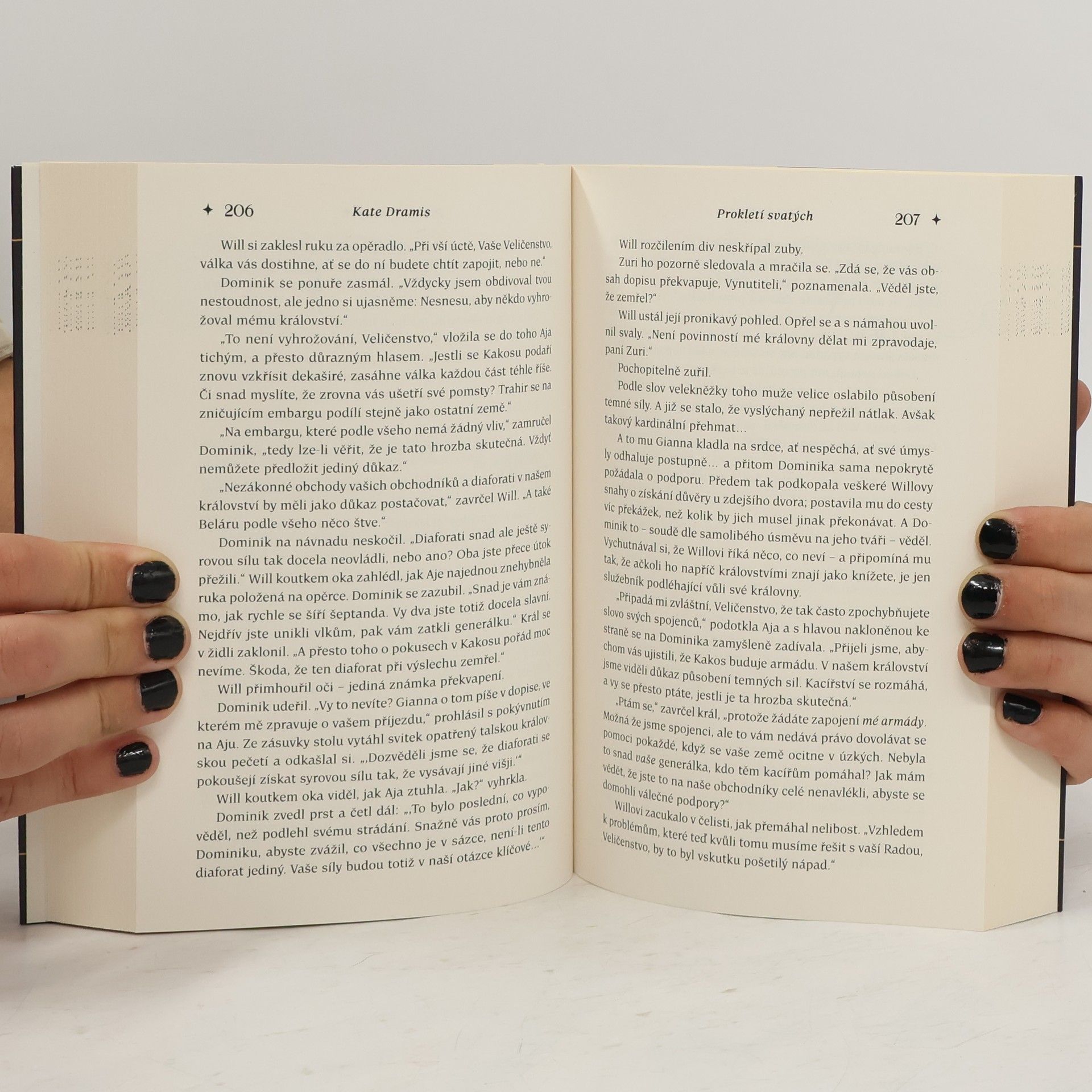 Je jejím posláním zachránit království, nebo ho zničit? Aja je vyzvědačkou královny a přísahala na svou krev, že bude bojovat, aby chránila nejenom svou zemi, ale také ty, kdo slouží po jejím boku, tedy i královnina vynutitele Willa, svého dlouholetého rivala. Když se začnou šířitzvěsti, že v nedalekém království chtějí probudit temné síly, pověří královna právě Aju a Willa, aby záležitost vyšetřili. Jenže během toho se ukáže, že Ajin zvláštní dar a síla se vymykají a chovají se nepředvídatelně. Aja se odváží stát se zbraní ve válce, kterou neumí vyhrát. A když se pak nečekaně změní její vztah s Willem, nikdo neví, jakému nebezpečí budou muset čelit... Svět, který Kate Dramis stvořila v Prokletí svatých, má vlastní zeměpis, vlastní kulturu a vlastní politické konflikty. Mohl by zaujmout čtenáře, kteří si oblíbili Leigh Bardugo.
