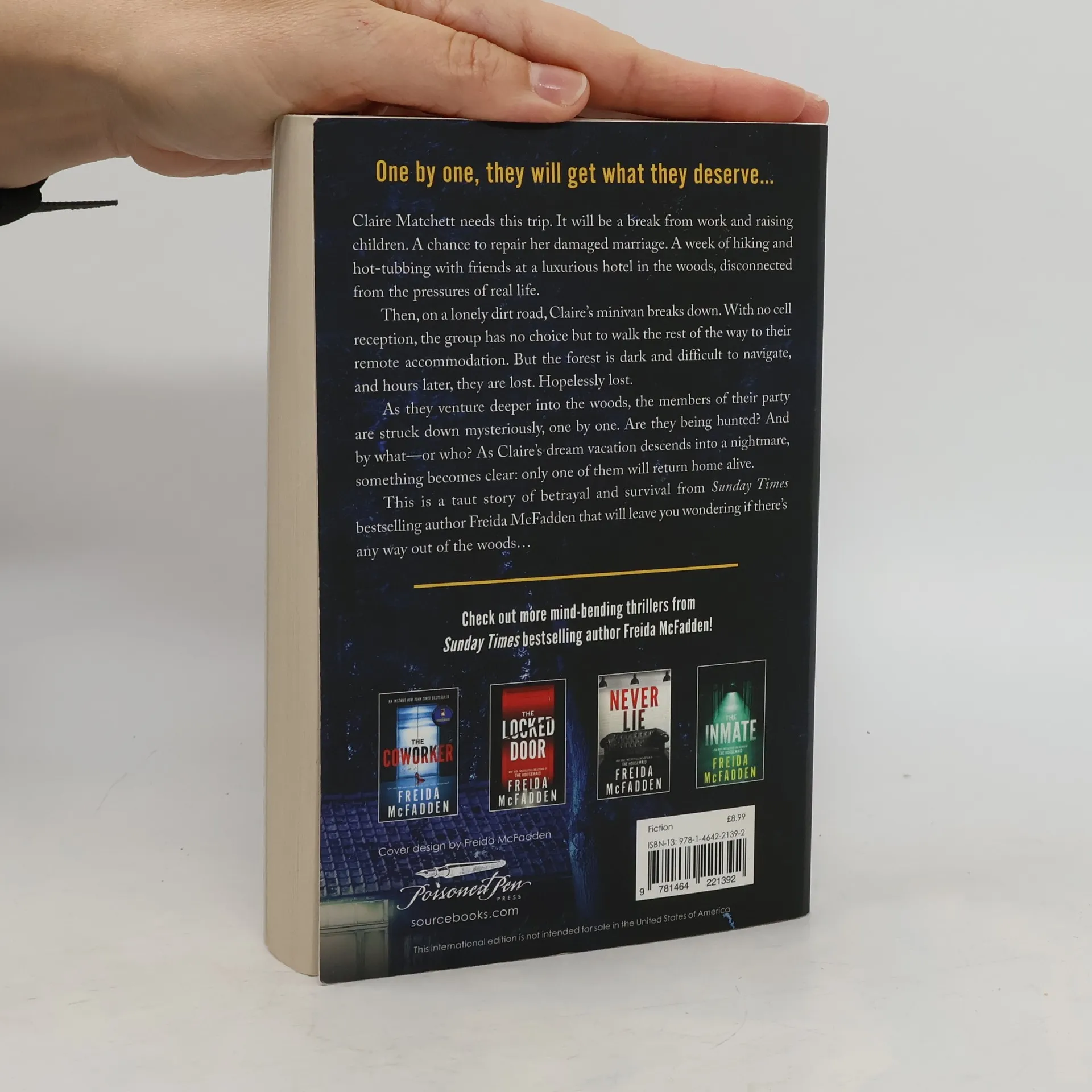 From New York Times bestselling author Freida McFadden comes a dark, twisting thriller about a group of friends lost in the woods- one by one, they each will fall, and only the killer will return home alive... A night spent sleeping on dirt and leaves is not how Claire Matchett expected to spend her vacation. She thought this would be a break from the stresses of work and raising her young children. A chance to repair her damaged marriage. A week of hiking and hot tubs with friends. It sounded like heaven. Then Claire's minivan breaks down on a lonely dirt road. With no cell reception, the group has no choice but to hike the rest of the way to their hotel. But it turns out the woods aren't as easy to navigate as they thought. Hours later, they are lost. Hopelessly lost. And as they navigate deeper into the woods, the members of their party are struck down mysteriously one by one. Has a wild animal been hunting them? Or is the hunter one of them? But as more time passes, one thing becomes clear- Only one of them will return home alive.