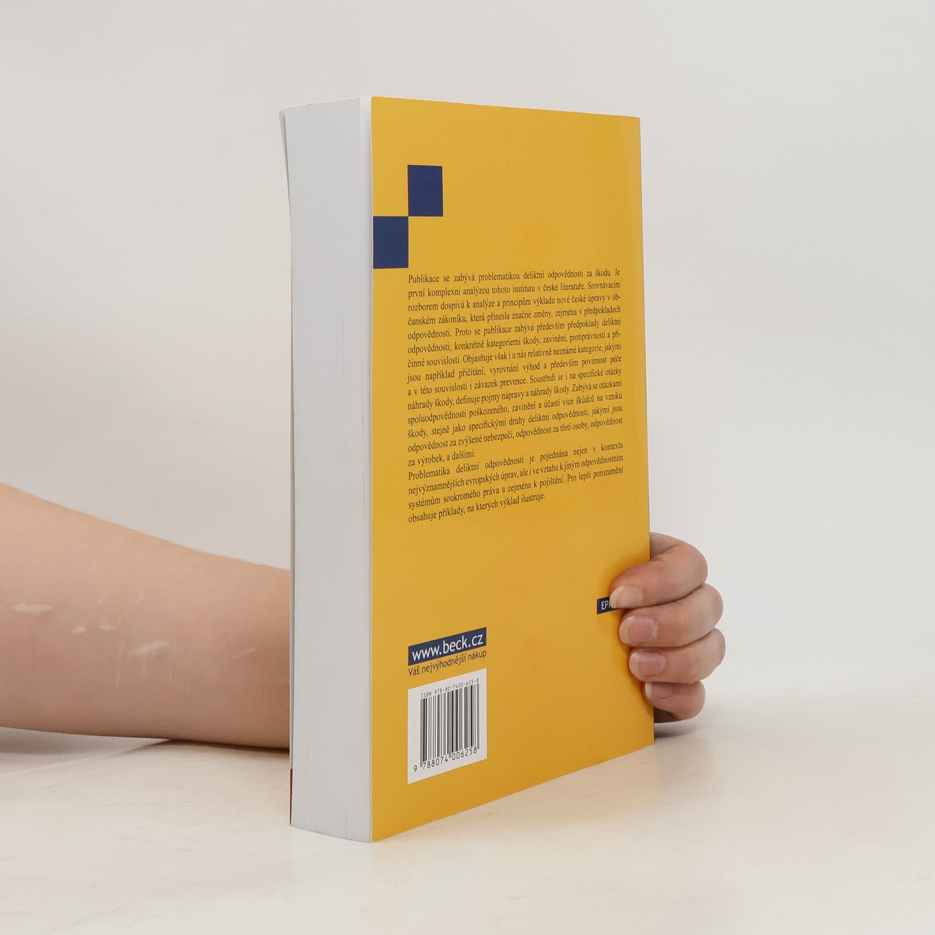 Publikace se zabývá problematikou deliktní odpovědnosti za škodu. Je první komplexní analýzou tohoto institutu v české literatuře. Srovnávacím rozborem dospívá k analýze a principům výkladu nové české úpravy v občanském zákoníku, která přinesla značné změny, zejména v předpokladechodpovědnosti. Proto se publikace zabývá především předpoklady deliktní odpovědnosti, konkrétně kategoriemi škody, zavinění, protiprávnosti a příčinné souvislosti. Objasňuje však i u nás relativně neznámé kategorie, jakými jsou například přičítání, vyrovnání výhod a především povinnost péče a v této souvislosti i závazek prevence. Soustředí se i na specifické otázky náhrady škody, definuje pojmy nápravy a náhrady škody. Zabývá se otázkami spoluodpovědnosti poškozeného, zavinění a účastí více škůdců na vzniku škody, stejně jako specifickými druhy deliktní odpovědnosti, jakými jsou odpovědnost za zvýšené nebezpečí, odpovědnost za třetí osoby, odpovědnost za výrobek, a dalšími. Problematika deliktní odpovědnosti je pojednána nejen v kontextu nejvýznamnějších evropských úprav, ale i ve vztahu k jiným odpovědnostním systémům soukromého práva a zejména k pojištění.