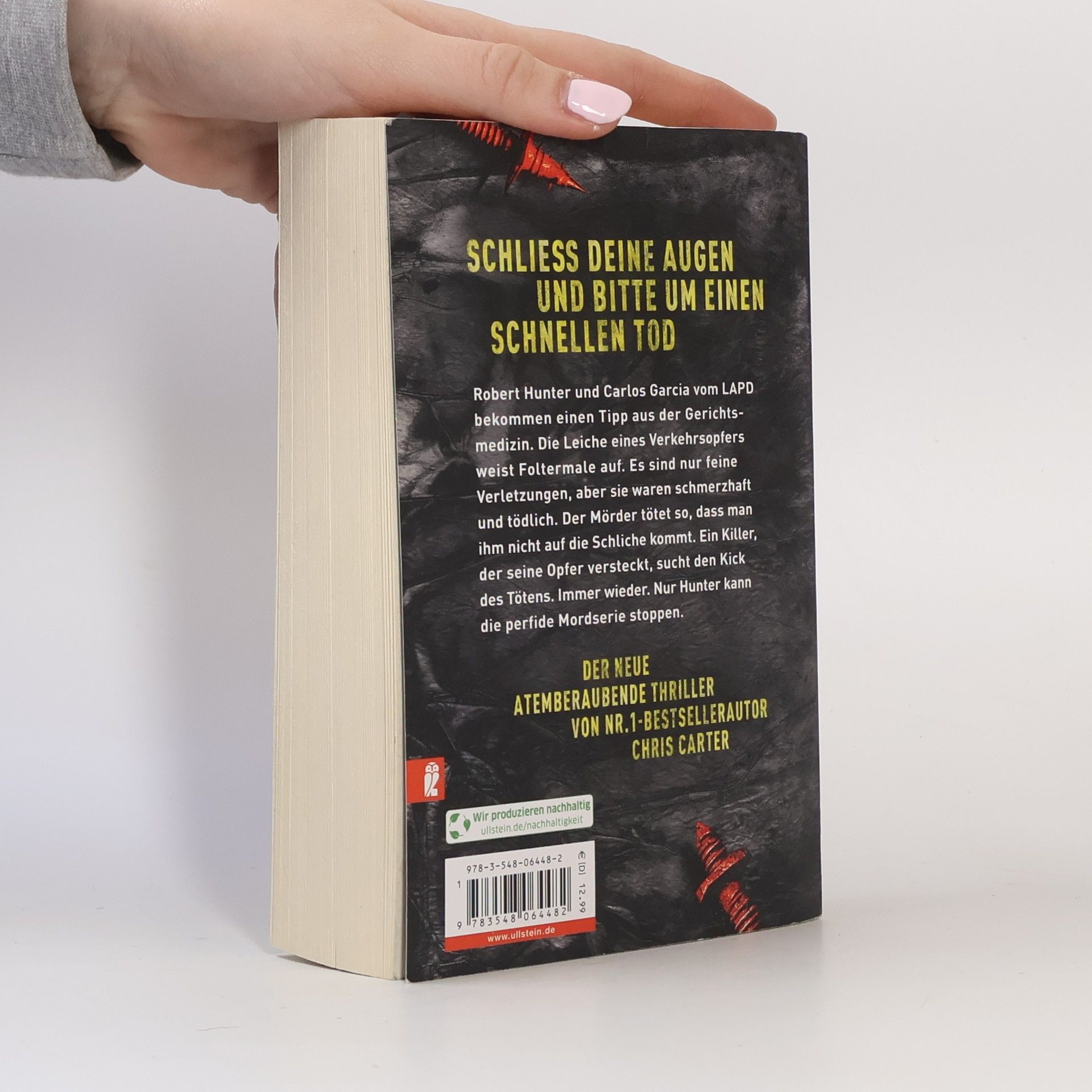 Schließ deine Augen und bitte um einen schnellen Tod Bei der Autopsie eines Verkehrsopfers entdeckt Gerichtsmedizinerin Dr. Hove etwas Seltsames. Tödliche Wunden unter der Haut, die nicht vom Unfall stammen können. Sie ist auf das Werk eines Serienkillers gestoßen. Unbemerkt und mit enormer Expertise lässt er jeden seiner brutalen Morde wie ein zufälliges Unglück aussehen. Dr. Hove meldet ihren Verdacht Robert Hunter und Carlos Garcia vom LAPD Ultra Violent Crimes Unit. Die Detectives stehen vor einem Problem. Wie ermittelt man in einer Mordserie, wenn die Opfer nicht bekannt sind? Wie fängt man einen Killer, wenn es keinen Tatort gibt? Wie stellt man einen sadistischen Jäger, der ausgesprochen vorsichtig vorgeht? Wie hält man einen Unsichtbaren auf, dessen Existenz nicht zu beweisen ist? Der 13. Band der Nr.1-Bestsellerserie mit Profiler Robert Hunter Chris Carter hat jahrelang als Kriminalpsychologe für die Polizei in Los Angeles gearbeitet, das macht seine Bücher so einzigartig.