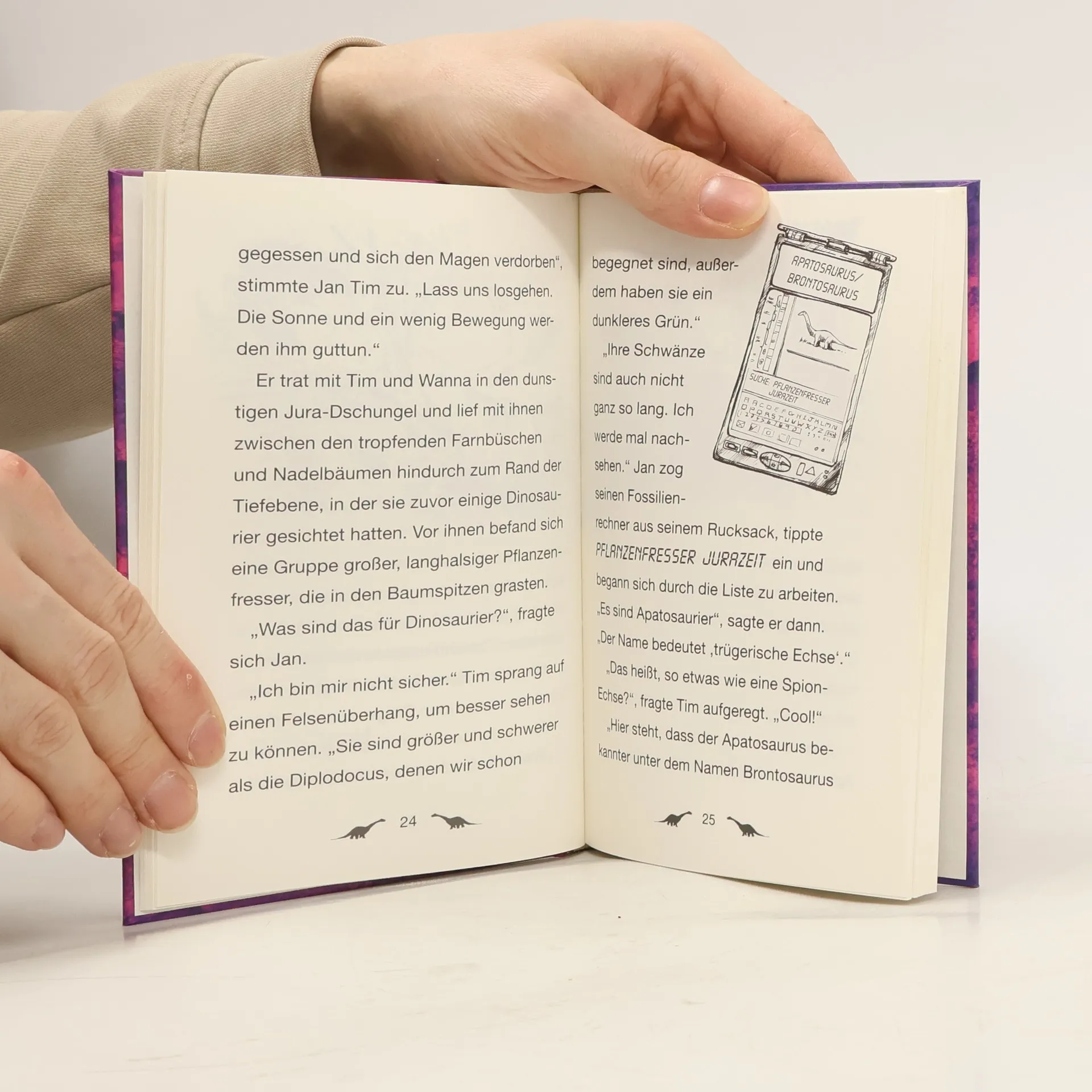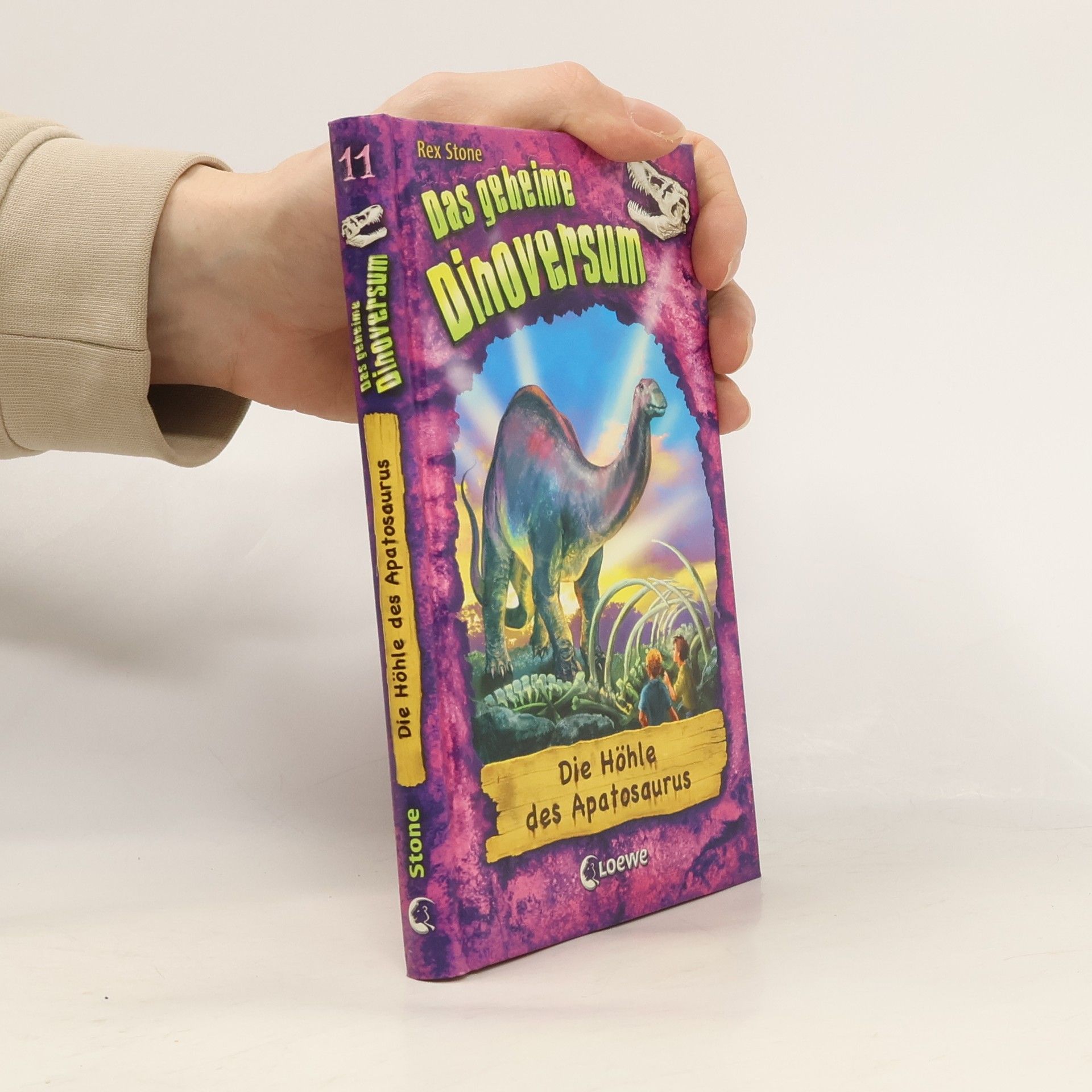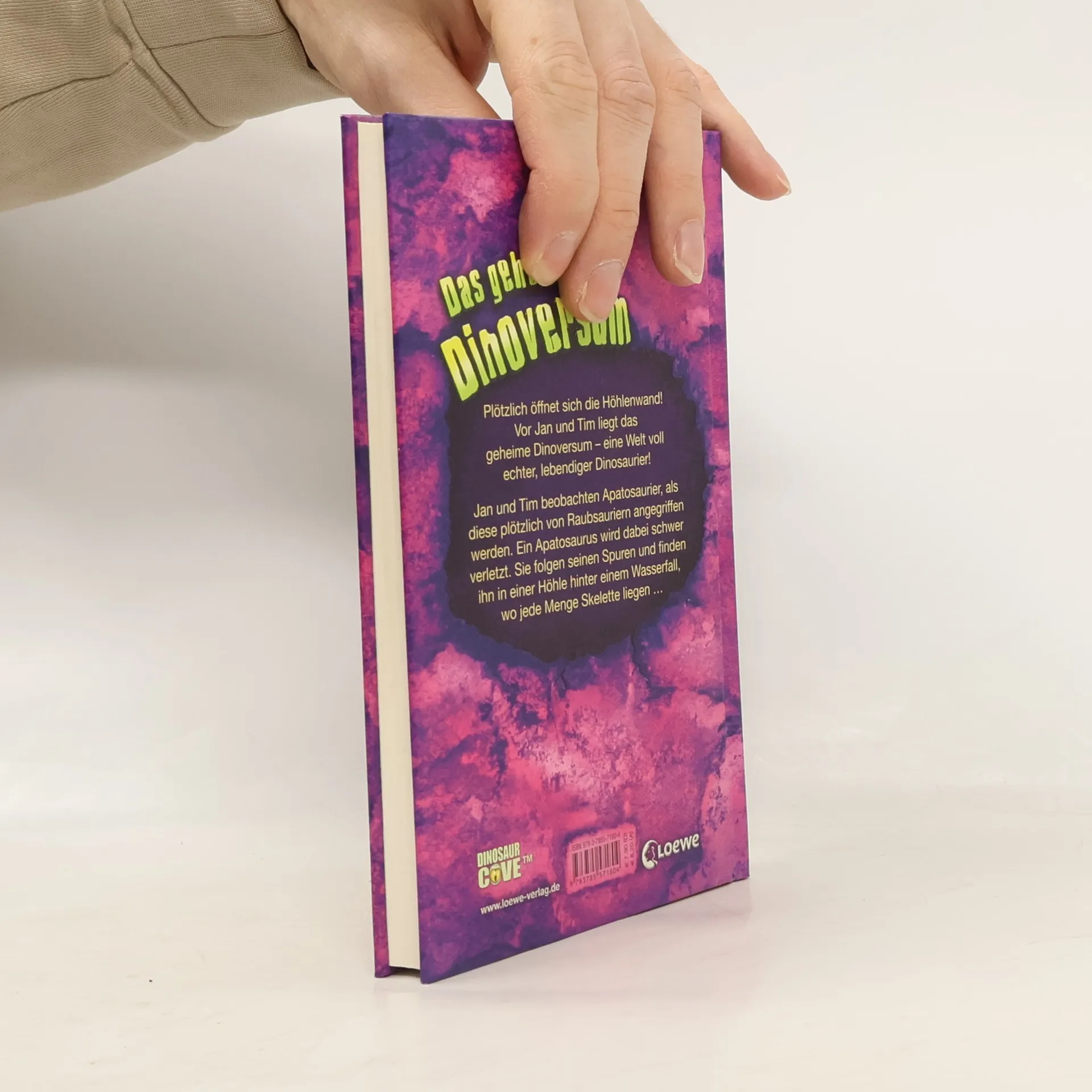 Jan und Tim beobachten eine Herde Apatosaurier, als diese plötzlich von Raubsauriern angegriffen wird. Ein Apatosaurier wird dabei schwer verletzt. Sie folgen seinen Spuren und finden ihn in einer Höhle hinter einem Wasserfall, wo jede Menge Skelette liegen ... Vor Jan und Tim liegt das geheime Dinoversum – eine Welt voll echter, lebendiger Dinosaurier ! Eine Kinderbuch-Reihe ab 7 Jahren mit spannenden Abenteuern und zahlreichen Illustrationen für alle Fans von Dinos und Jurassic Park .