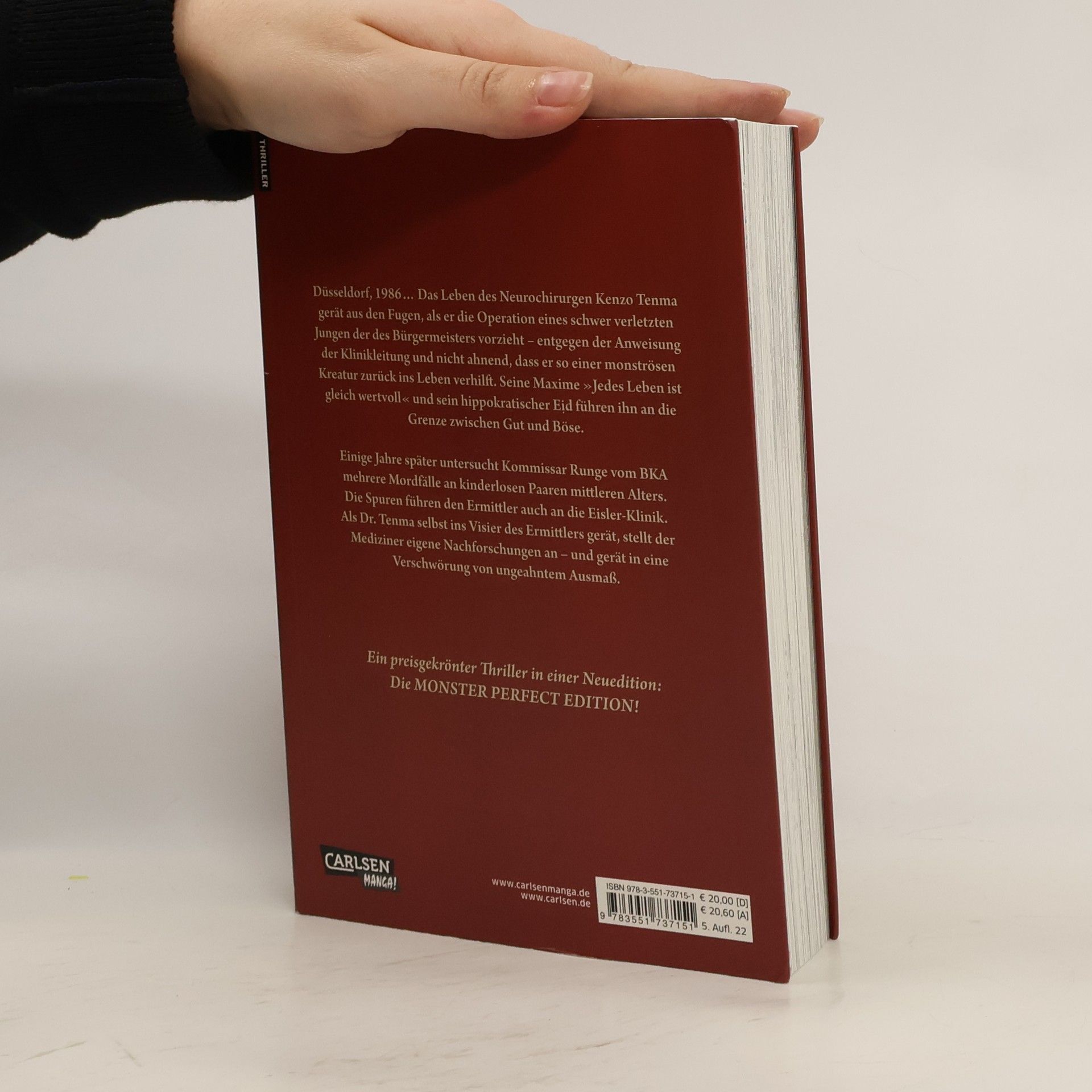 Düsseldorf 1986... Der brillante Neurochirurg Kenzo Tenma praktiziert an der Eisler-Klinik und hat eine strahlende Zukunft vor sich. Über die Entscheidung, lieber das Leben eines Jungen oder das des Bürgermeisters retten soll, verliert er fast alles, was ihm lieb ist: seine Verlobte, seine Karriere und seinen sozialen Status. Obwohl er die Entscheidung für richtig hält, fangen für ihn die Probleme damit erst an, als er es mit den Unbillen der Krankenhaus-Politik und Serienmorden zu tun bekommt und in eine große Verschwörung verstrickt wird... MONSTER von Naoki Urasawa zählt zu den absoluten Meisterwerken der Manga-Geschichte, zu deren Schauplätzen auch andere deutsche Städte wie Köln und Frankfurt am Main zählen. Der mehrfach preisgekrönte und auch als Anime-Serie adaptierte Thriller-Manga erscheint nun neu als Perfect Edition: in deutlich verbesserter Bildqualität, mit einigen Farbseiten und in Form großformatiger Doppelbände.
