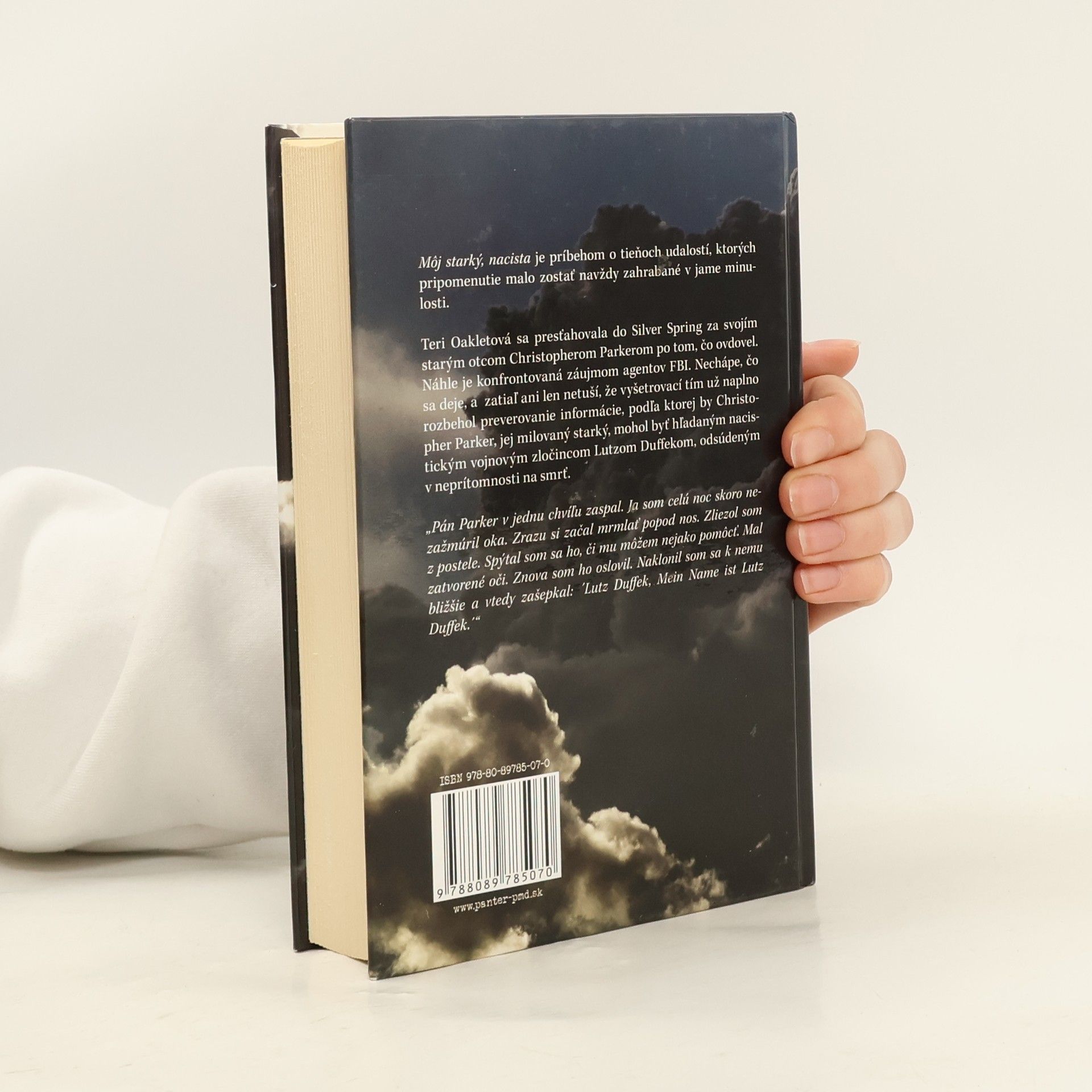 Debutová kniha od slovenského autora, píšuceho pod pseudonymom, je príbehom o tieňoch udalostí, ktorých pripomenutie malo zostať navždy zahrabané v jame minulosti. Teri Oakletová sa presťahovala do Silver Spring za svojím starým otcom Christopherom Parkerom po tom, čo ovdovel. Náhle je konfrontovaná záujmom agentov FBI. Nechápe, čo sa deje, a zatiaľ ani len netuší, že vyšetrovací tím už naplno rozbehol preverovanie informácie, podľa ktorej by Christopher Parker, jej milovaný starký, mohol byť hľadaným nacistickým vojnovým zločincom Lutzom Duffekom, odsúdeným v neprítomnosti na smrť. Pán Parker v jednu chvíľu zaspal. Ja som celú noc skoro nezažmúril oka. Zrazu si začal mrmlať popod nos. Zliezol som z postele. Spýtal som sa ho, či mu môžem nejako pomôcť. Mal zatvorené oči. Znova som ho oslovil. Naklonil som sa k nemu bližšie a vtedy zašepkal: ´Lutz Duffek, Mein Name ist Lutz Duffek.´