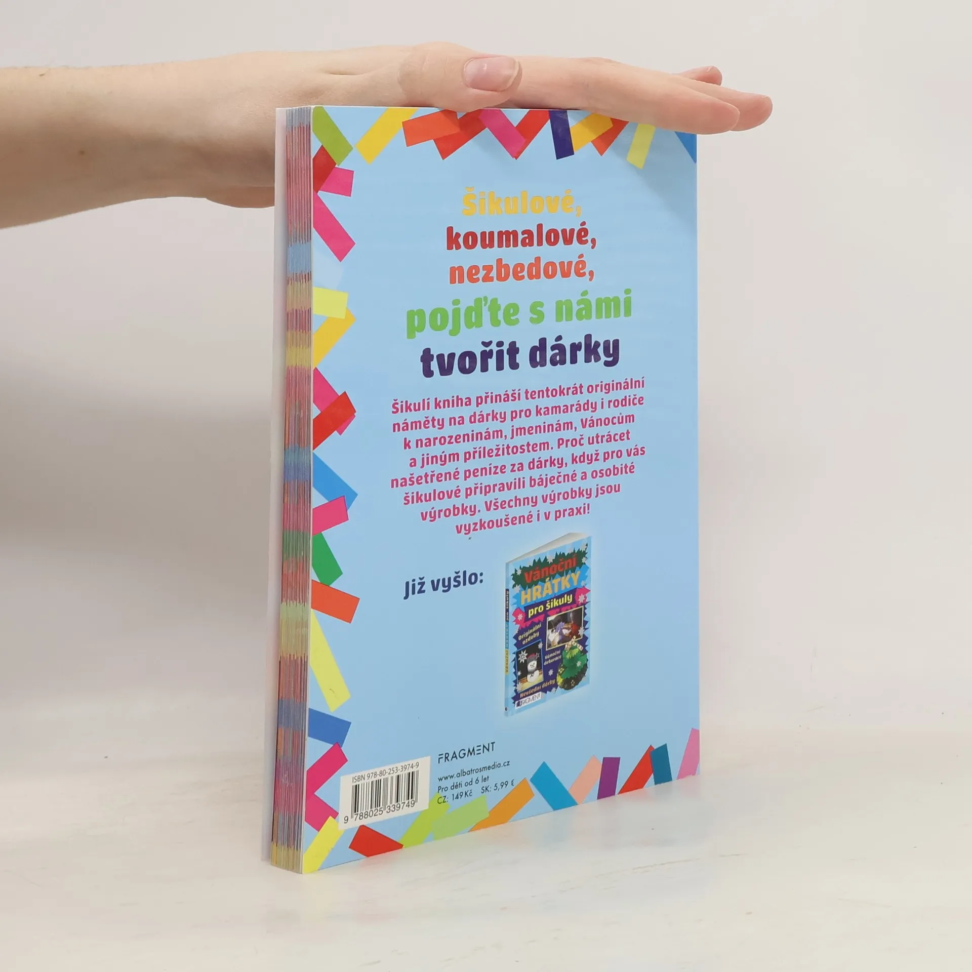 Šikulí kniha přináší tentokrát originální náměty na dárky pro kamarády i rodiče k narozeninám, jmeninám, Vánocům a jiným příležitostem. Proč utrácet našetřené peníze za dárky, když pro vás šikulové připravili báječné a osobité výrobky. Všechny výrobky jsou vyzkoušené i v praxi. Chobotnička a květiny z vlny Lapač snů Kapsa na pastelky Papírový šašík Závěsné dekorace Veselý organizér …a další superdárky .