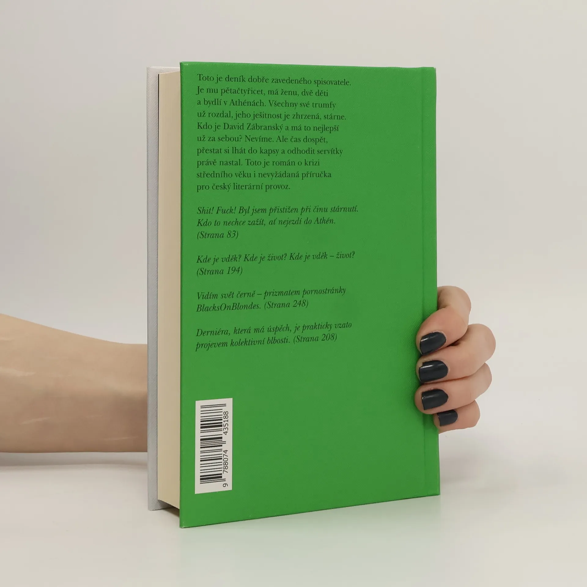 Toto je deník dobře zavedeného spisovatele. Je mu pětačtyřicet, má ženu, dvě děti a bydlí v Athénách. Všechny své trumfy už rozdal, jeho ješitnost je zhrzená, stárne. Kdo je David Zábransky a má to nejlepší už za sebou? Nevíme. Ale čas dospět, přestat si lhát do kapsy a odhodit servítky právě nastal. Toto je román o krizi středního věku i nevyžádaná přírucka pro česky literární provoz. Shit! Fuck! Byl jsem přistižen při činu stárnutí. Kdo to nechce zažít, ať nejezdí do Athén. (Strana 83) Kde je vděk? Kde je život? Kde je vděk – život? (Strana 194) Vidím svět černě – prizmatem pornostránky BlacksOnBlondes. (Strana 248) Derniéra, která má úspěch, je prakticky vzato projevem kolektivní blbosti. (Strana 208)
