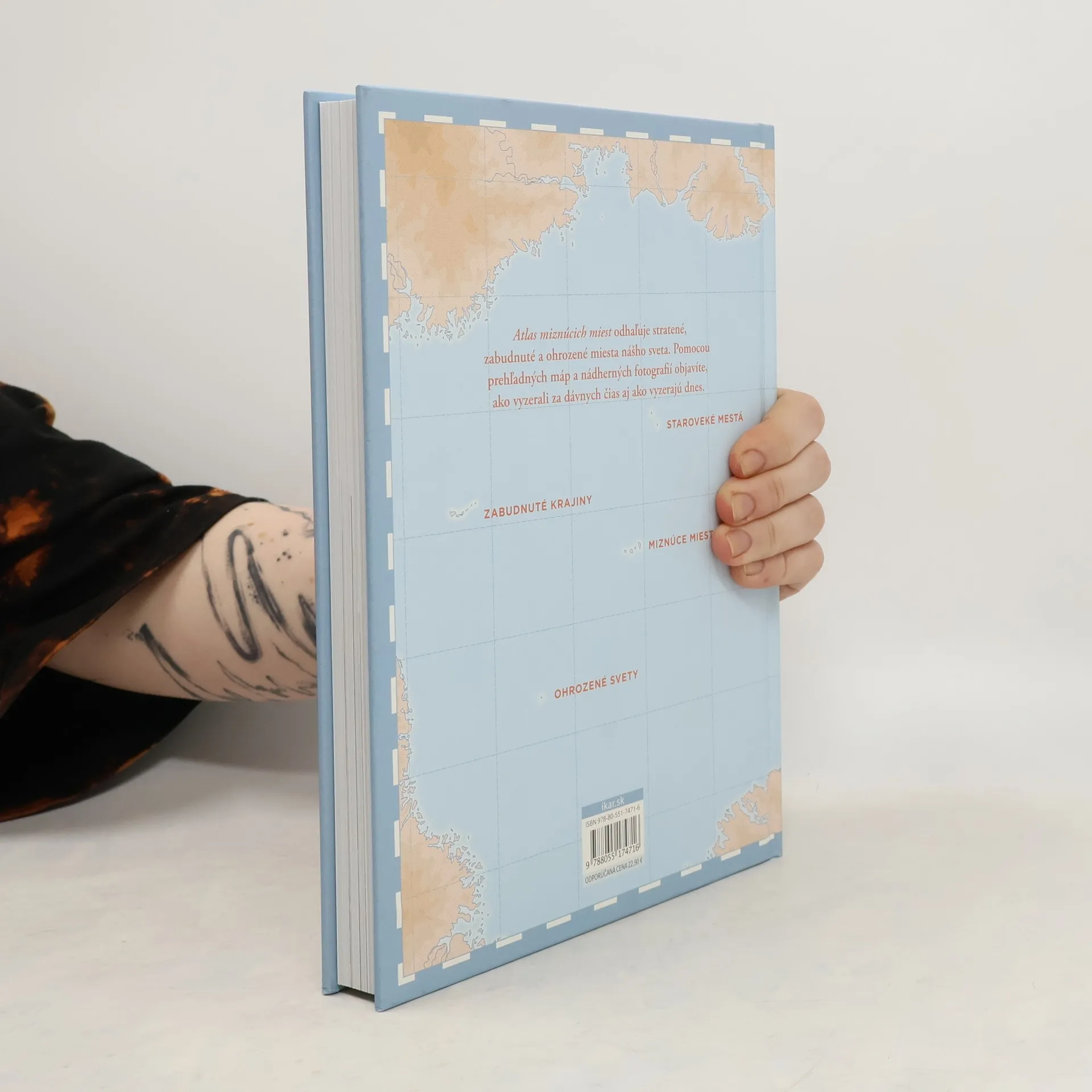 Mapy nám predstavujú svet taký, aký je teraz aj aký bol v minulosti. Čo však miesta, ktoré už nemožno zmapovať? Mestá zaviate prachom, pochované pod dnešnou výstavbou? Rieky a moria, ktoré menia tvar aj okolitú krajinu? Alebo dokonca miesta, ktoré úplne zmizli a nezanechali po sebe nijakú stopu? Travis Elborough vás vezme na cestu po všetkých kútoch sveta, aby ste spolu s ním hľadali, čo sa stratilo, zmizlo či zaniklo. Objavíte starobylé sídla moci a dávno zabudnuté civilizácie v mayskom Palenque, ponoríte sa do záhady zmiznutého japonského ostrovčeka a odhalíte neuveriteľné skryté miesta, ako je potopené mestečko Staré Adaminaby, kedysi opustené, no dnes sa postupne vynárajúce na svetlo sveta. Dozviete sa, aké nebezpečenstvo predstavuje meniaca sa hladina morí a čo všetko ohrozuje divy sveta vytvorené človekom aj prírodou, ako napríklad púšť Chihuahua alebo Čínsky múr. Preskúmate miesta, ktoré zmizli z moderných atlasov, a zistíte, ako svet vyzeral kedysi. Pomocou prehľadných máp a nádherných fotografií približuje Atlas miznúcich miest tieto lokality tak, ako vyzerali za dávnych čias aj ako vyzerajú dnes. Je fascinujúcim sprievodcom stratenými miestami a krehkými vzťahmi vo svete okolo nás.