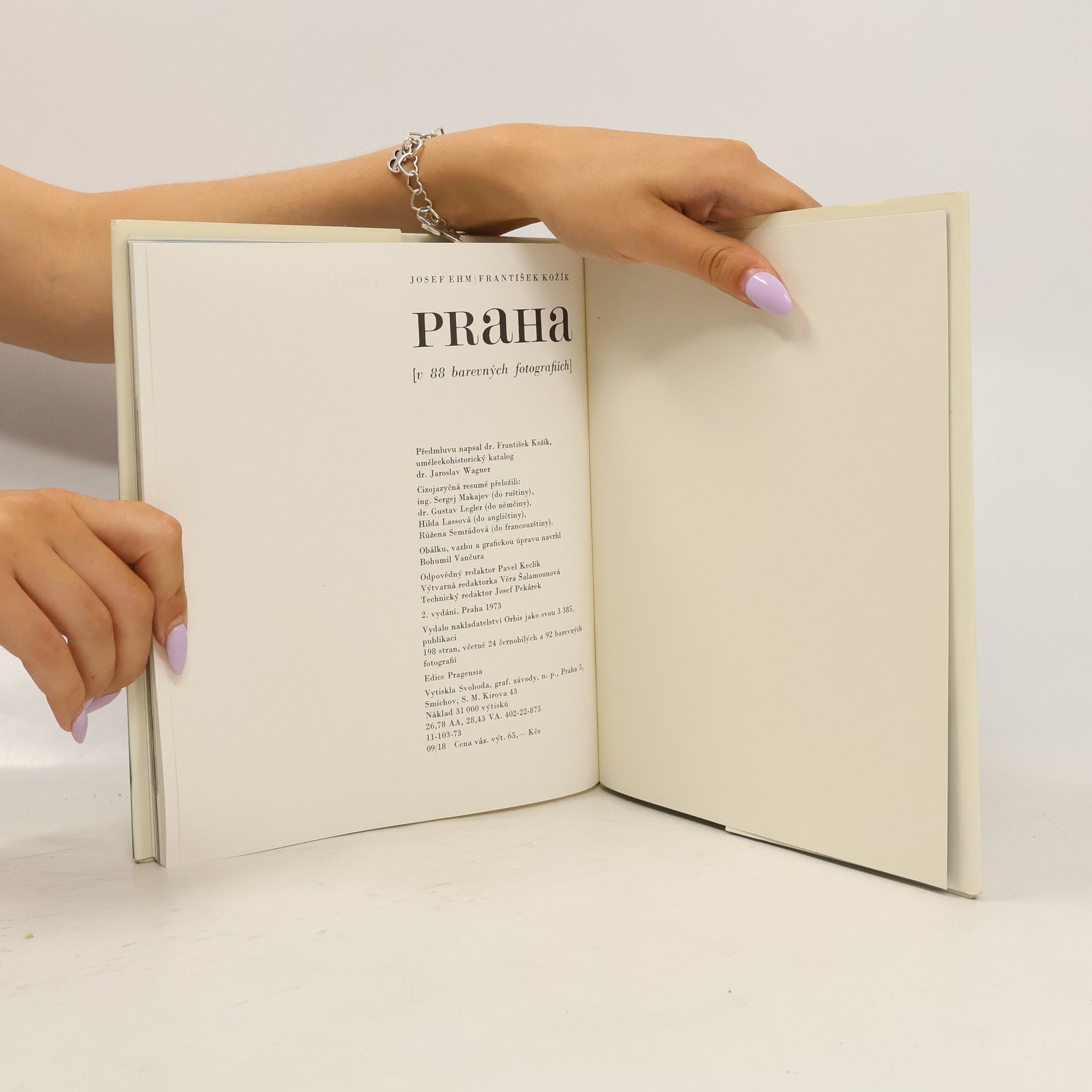 Praha ve fotografiích - 24 černobílých, 92 barevných. Cizojazyčné resumé v ruštině, němčině, angličtině a francouzštině. Reprezentativní publikace, v níž 88 barevných a 24 černobílých fotografií zavádí na Hradčany, Hrad, Malou Stranu, Staré Město, do ulic a náměstí městského centra i do pestré scenérie zahrad a sadů. Souhrnné vysvětlivky k obrázkům obsahují nejnutnější údaje o slozích a architektuře. Knihu uvádí esej F. Kožíka, nastiňující politickou, kulturní a uměleckou historii Prahy.