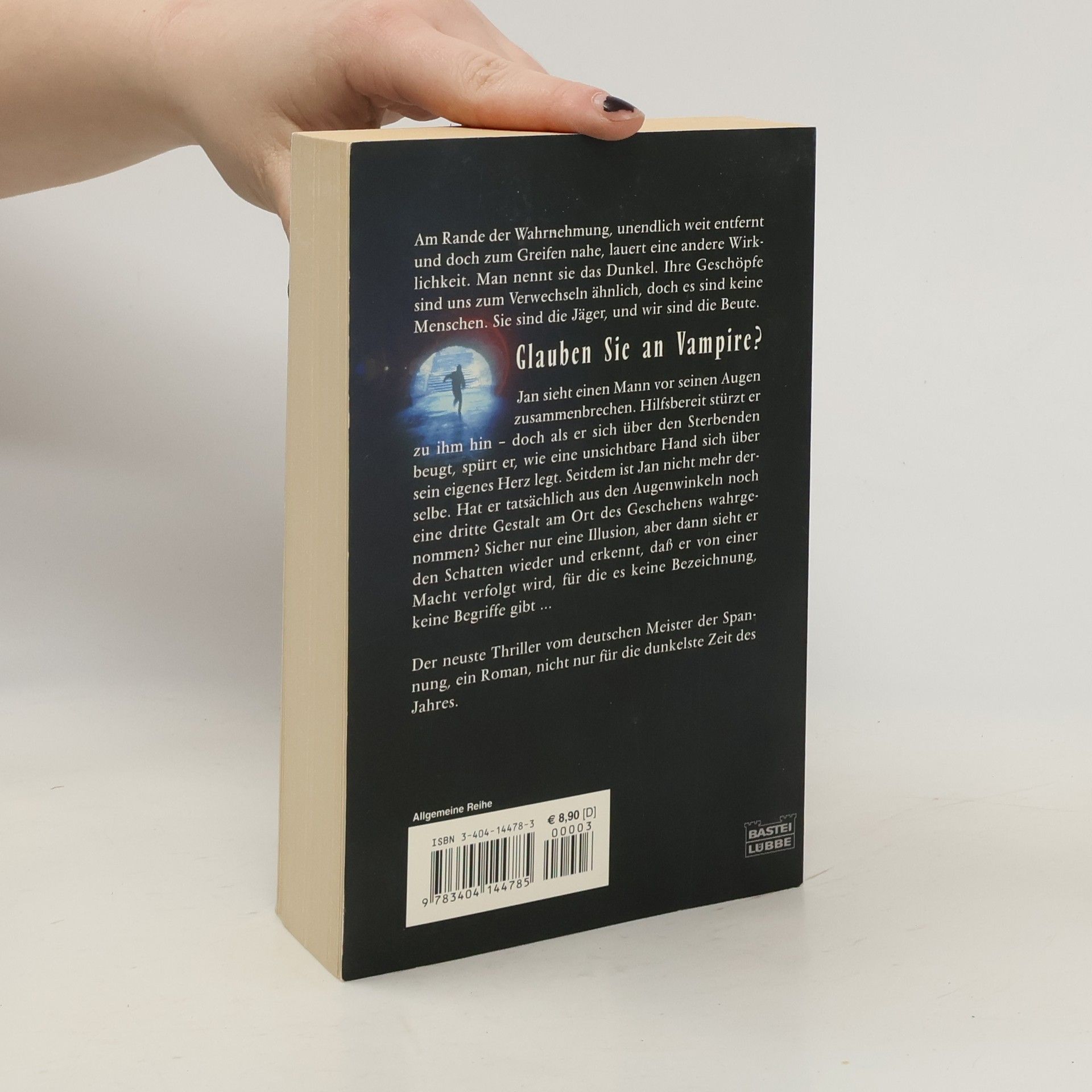 Am Rande der Wahrnehmung, unendlich weit entfernt und doch zum Greifen nahe, lauert eine andere Wirklichkeit. Man nennt sie das Dunkel. Ihre Geschöpfe sind uns zum Verwechseln ähnlich, doch es sind keine Menschen. Sie sind die Jäger, und wir sind die Beute. Glauben Sie an Vampire? Jan sieht einen Mann vor seinen Augen zusammenbrechen. Hilfsbereit stürzt er zu ihm hin - doch als er sich über den Sterbenden beugt, spürt er, wie eine unsichtbare Hand sich über sein eigenes Herz legt. Seitdem ist Jan nicht mehr derselbe. Hat er tatsächlich aus den Augenwinkeln noch eine dritte Gestalt am Ort des Geschehens wahrgenommen? Sicher nur eine Illusion, aber dann sieht er den Schatten wieder und erkennt, daß er von einer Macht verfolgt wird, für die es keine Bezeichnung, keine Begriffe gibt ...