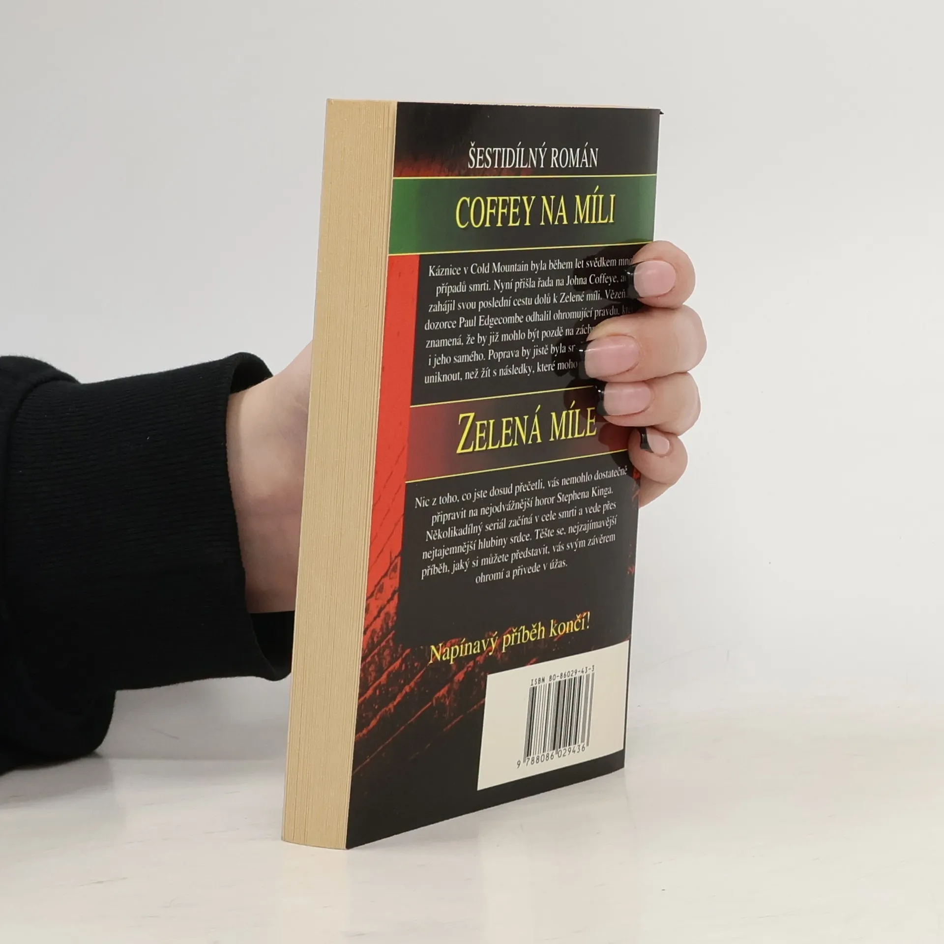 Káznice v Cold Mountain byla během let svědkem mnoha případů smrti. Nyní přišla řada na Johna Coffeye, aby zahájil svou poslední cestu dolů k Zelené míli. Vězeňský dozorce paul Edgecombe odhalil ohromující pravdu, která znamená, že by již mohlo být pozdě na záchranu Coffeye i jeho samého. Poprava by jistě byla snazší způsob, jak uniknout, než žít s následky, které mohou trvat věčnost… Nic z toho, co jste dosud přečetli, vás nemohlo dostatečně připravit na nejodvážnější horor Stephena Kinga. Několikadílný seriál začíná v cele smrti a vede přes nejtajemnější hlubiny srdce. Těšte se, nejzajímavější příběh, jaký si můžete představit, vás svým závěrem ohromí a přivede v úžas.