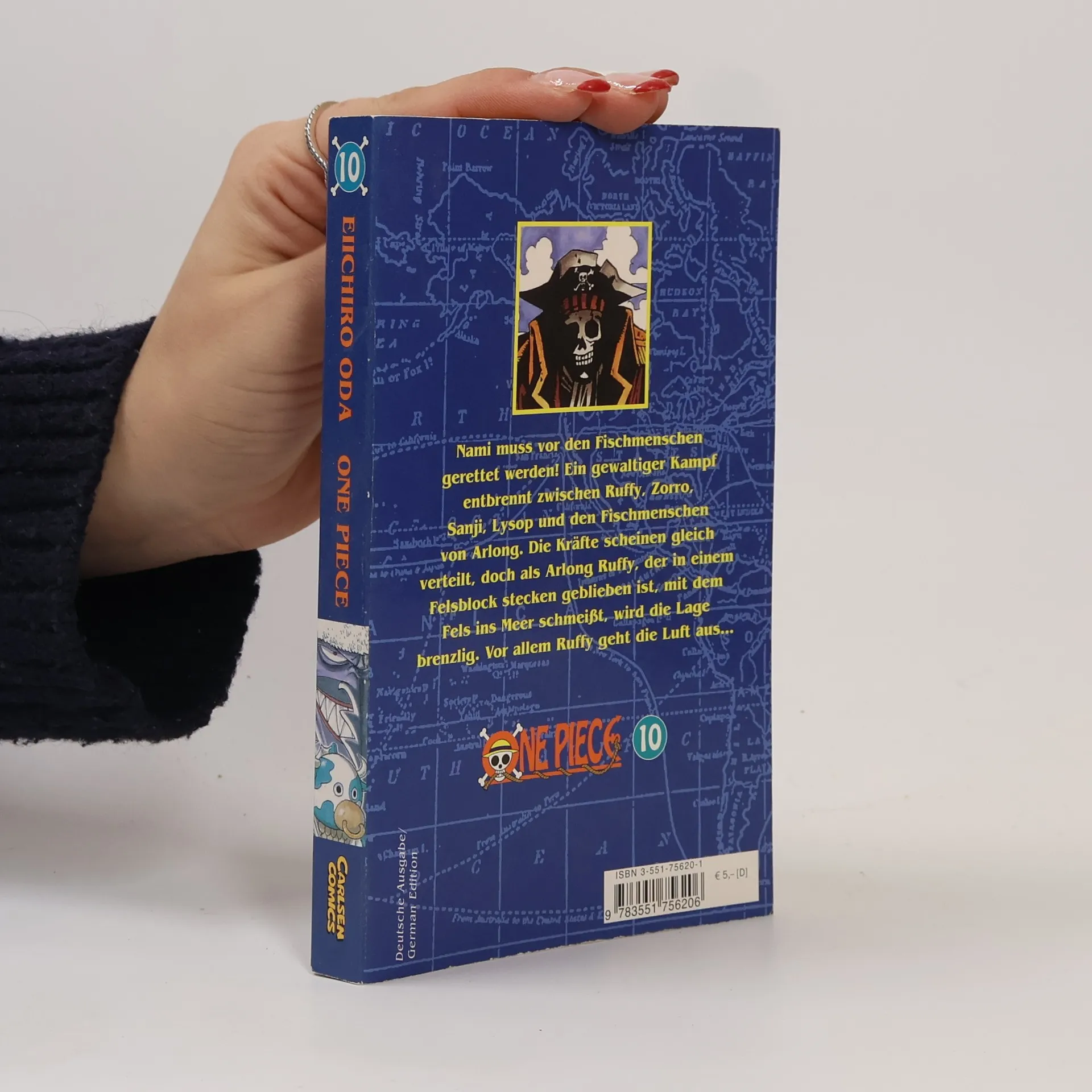 Der beliebteste Manga der Welt! Erlebe die Geschichte des zukünftigen Königs der Piraten in einer unvergleichlichen Geschichte voller Action, Abenteuer, Dramatik, Freundschaft und Humor. Mit über 500 Millionen verkauften Bänden weltweit ist One Piece die meistverkaufte Mangaserie der Geschichte! Nami muss vor den Fischmenschen gerettet werden! Ein gewaltiger Kampf entbrennt zwischen Ruffy, Zorro, Sanji, Lysop und den Fischmenschen von Arlong. Die Kräfte scheinen gleich verteilt, doch als Arlong Ruffy, der in einem Felsblock stecken geblieben ist, mit dem Fels ins Meer schmeißt, wird die Lage brenzlig. Vor allem Ruffy geht die Luft aus... Für Fans von Naruto, Dragon Ball, My Hero Academia und Fairy Tail!