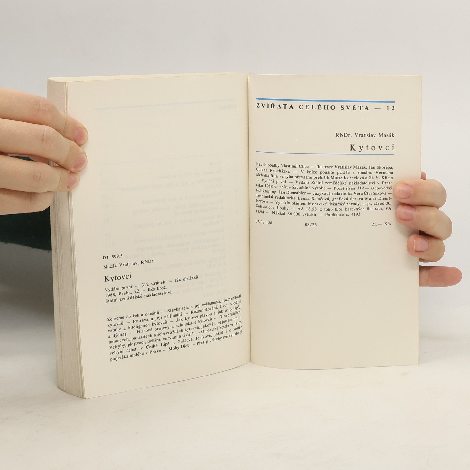 Základní informace o životě kytovců a výčet všech dnes žijících druhů včetně jejich vyobrazení. Obsahuje rovněž informace o velrybářství, skutečném Moby Dickovi, a kostech kytovců v československých muzejních sbírkách. Nejrozsáhlejší svazek edice, jak textově, tak obrazově, aby českému čtenáři poskytl poněkud hlubší pohled na tvory, které nemá možnost běžně vídat. Ilustrace autor, množství fotografií a archivních obrázků. 07-034-88