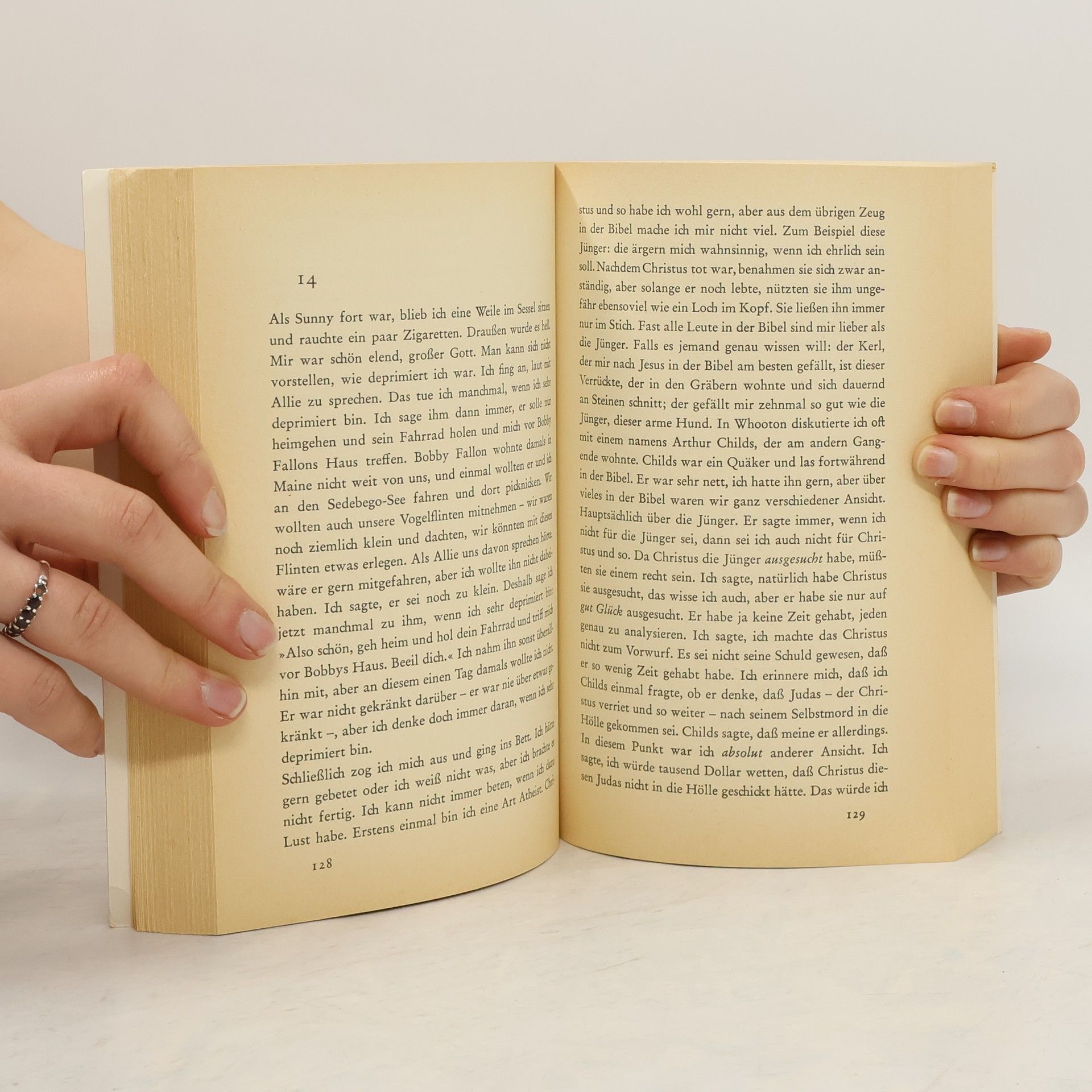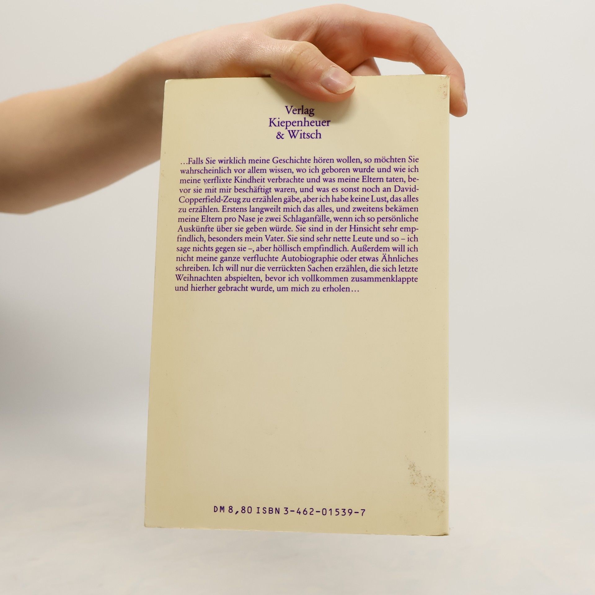 ...Falls Sie wirklich meine Geschichte hören wollen, so möchten Sie wahrscheinlich vor allem wissen, wo ich geboren wurde und wie ich meine verflixte Kindheit verbrachte und was meine Eltern taten, be-vor sie mit mir beschäftigt waren, und was es sonst noch an David-Copperfield-Zeug zu erzählen gäbe, aber ich habe keine Lust, das alles zu erzählen. Erstens langweilt mich das alles, und zweitens bekämen meine Eltern pro Nase je zwei Schlaganfälle, wenn ich so persönliche Auskünfte über sie geben würde. Sie sind in der Hinsicht sehr emp-findlich, besonders mein Vater. Sie sind sehr nette Leute und so - ich sage nichts gegen sie -, aber höllisch empfindlich. Außerdem will ich nicht meine ganze verfluchte Autobiographie oder etwas Ähnliches schreibe. Ich will nur die verrückten Sachen erzählen, die sich letzte Weihnachten abspielten, bevor ich vollkommen zusammenklappte und hierher gebracht wurde, um mich zu erholen... --back cover