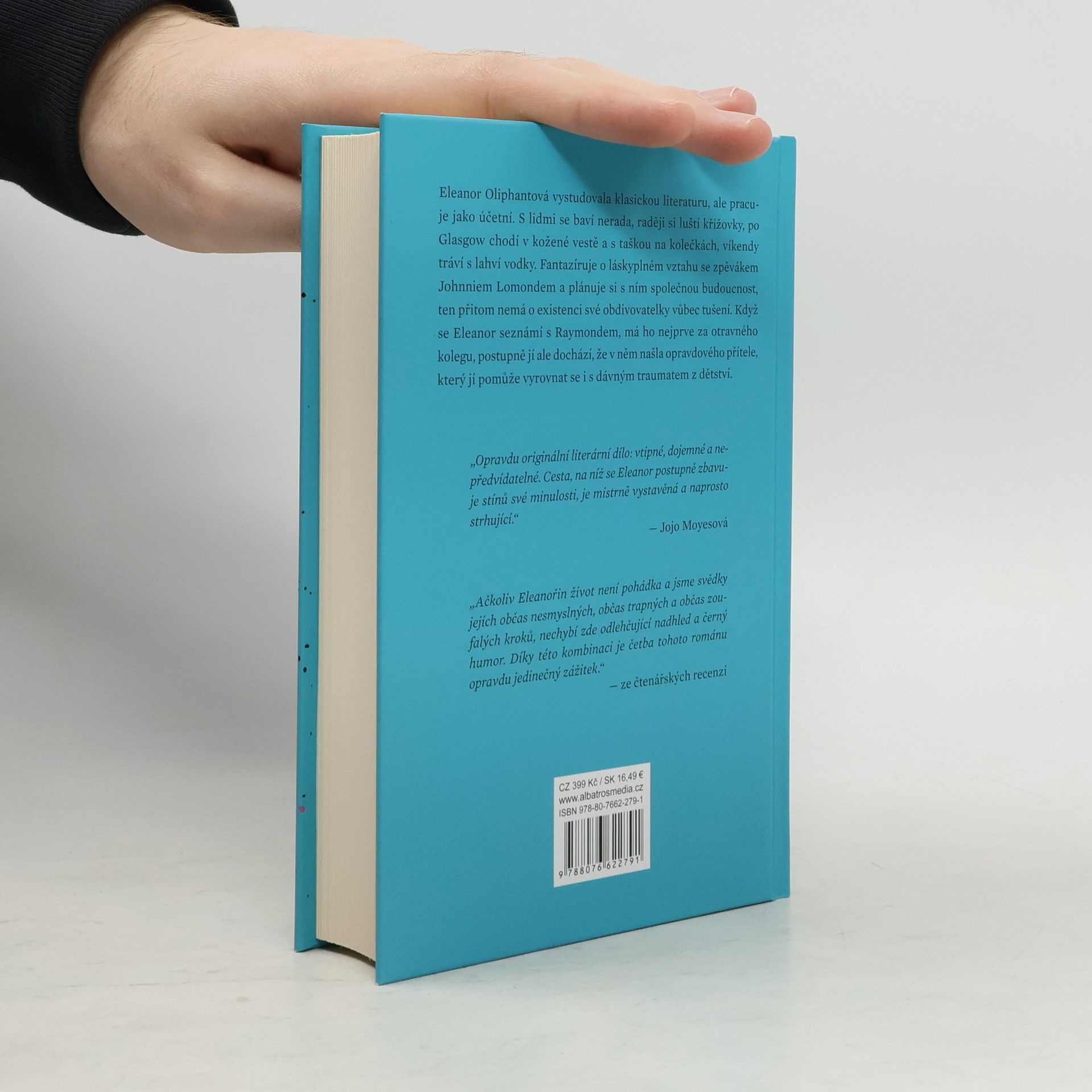 Literární senzace pro všechny asociály Svérázné Eleanor je jedno, co si o ní kdo myslí. Vystudovala literaturu, ale pracuje jako účetní. Miluje křížovky, po Glasgow chodí s taškou na kolečkách a víkendy tráví se svou jedinou kamarádkou – vodkou. Když pozná Raymonda, má ho jen za otravného kolegu. Mnohem víc ji zajímá místní zpěvák, se kterým si plánuje budoucnost. Co na tom, že on o její existenci nemá ani ponětí. Eleanořině cestě za štěstím se budete smát, i když k smíchu vlastně není.