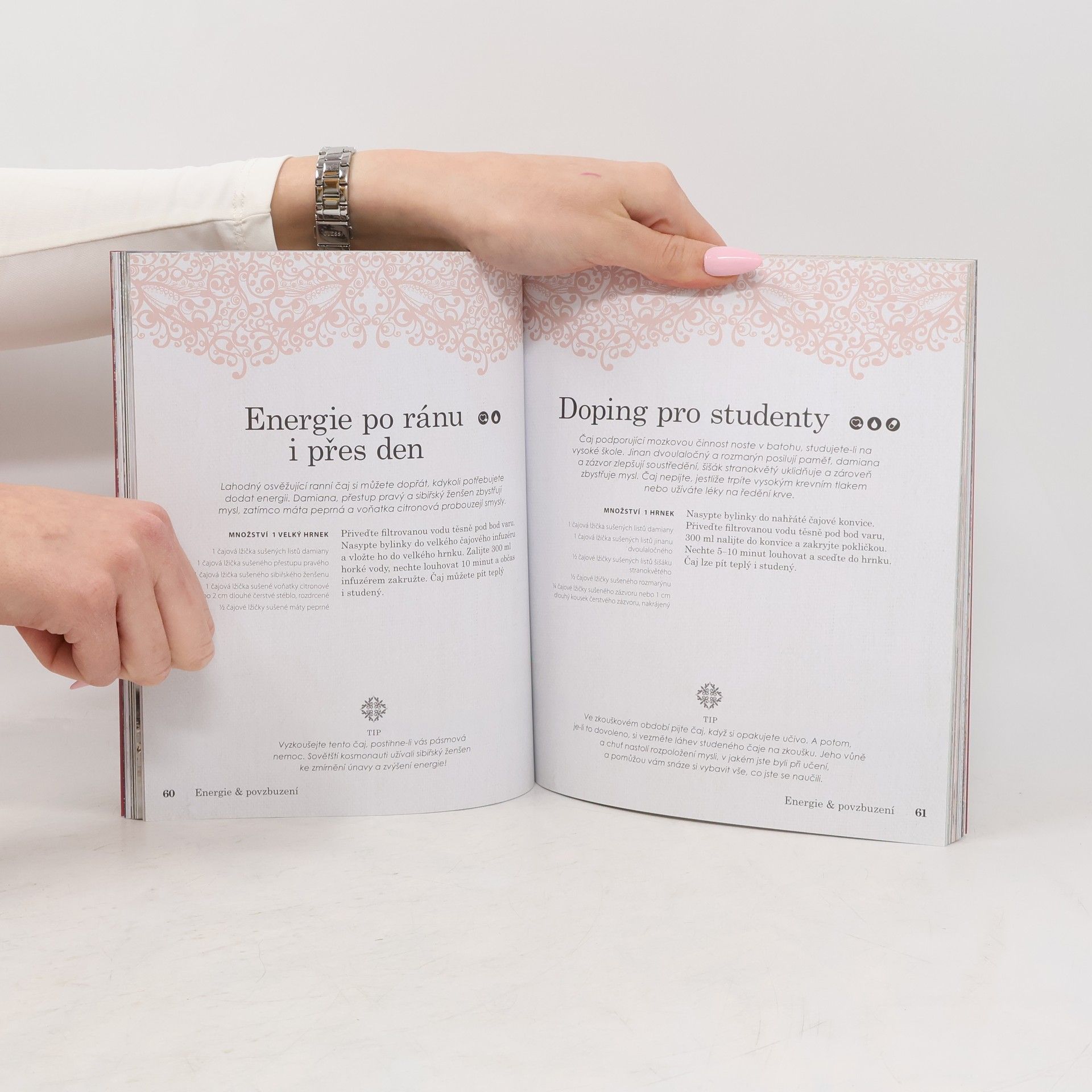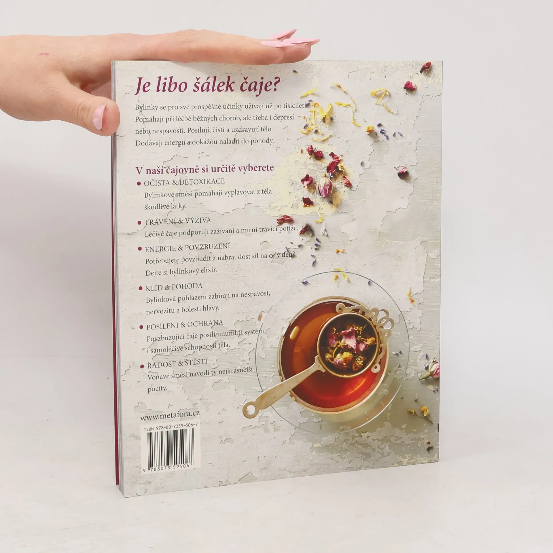 V téhle „čajové krabičce“, sbírce dokonale sestavených receptů najdete bylinkové čaje na všechny možné neduhy těla i ducha. Čekají vás tu čaje proti nachlazení, na dobré spaní a správné trávení, na zahřátí v zimě i ochlazení v létě, elixír pro odvahu či energii, stejně jakoodvar pro uklidnění a relaxaci. A to samozřejmě zdaleka není všechno. Potřebujete posílit imunitu? Žádný problém. Máme pro vás čaj plný antioxidantů a dalších prospěšných látek, který pomůže zvýšit odolnost proti nemocem. A co takhle čaj pro štěstí? Taky máme. Posaďte se s voňavým šálkem do pohodlného křesla a uvidíte, jak vám vyloudí úsměv na tváři. Chcete ráno plni energie vyskočit z postele? Tak to si nalistujte a uvařte čaj na dobré ráno. Všechno vám půjde pěkně od ruky. Nakonec kniha nabídne ještě přehledný Herbář se všemi bylinkami, které jsou ve všech receptech použité. Dozvíte se o jejich vlastnostech a účincích, takže vždycky budete vědět, na jaké problémy se která hodí a naučíte se míchat své vlastní směsi přímo na míru.