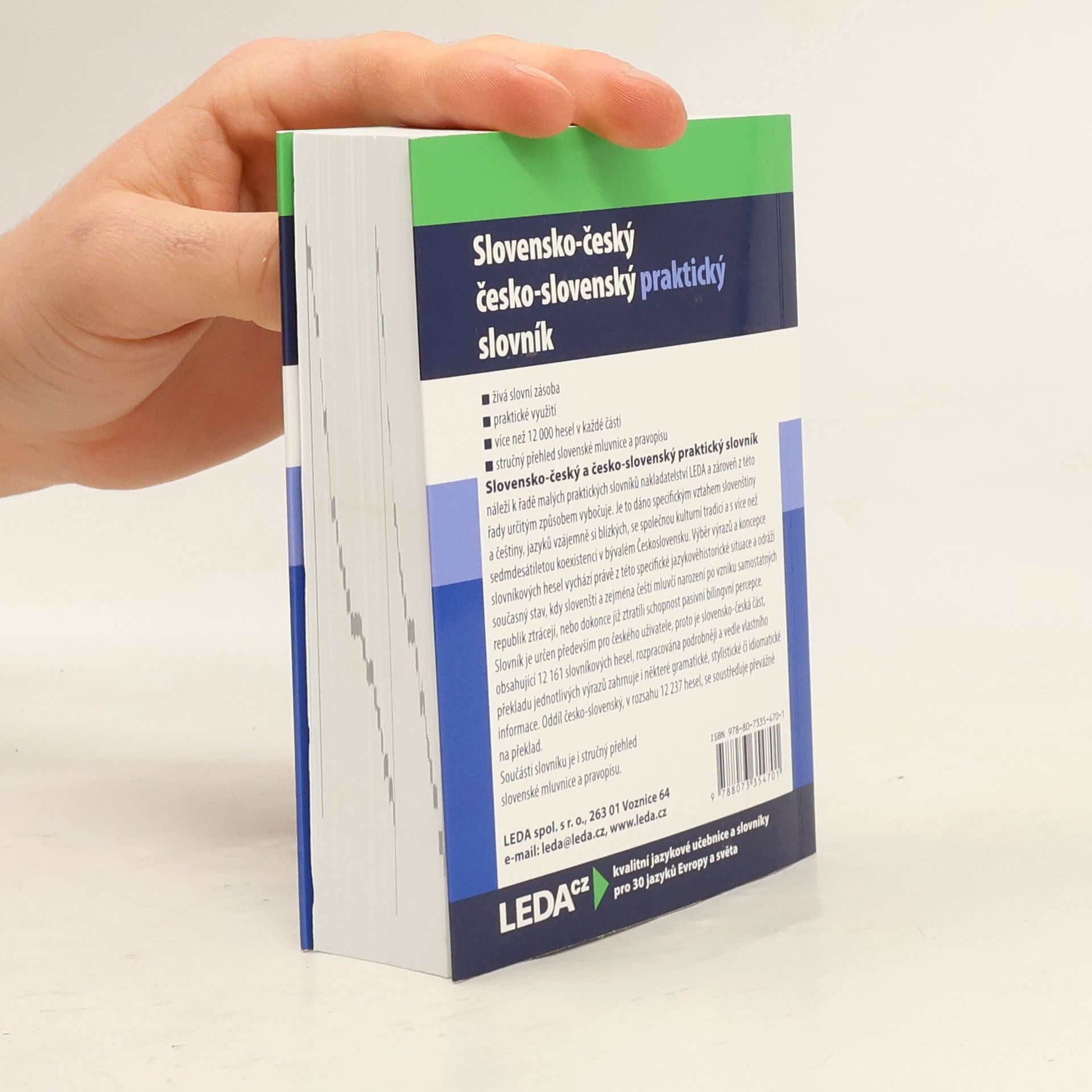 Praktický slovensko-český a česko-slovenský slovník náleží k řadě malých praktických slovníků nakladatelství LEDA a zároveň z této řady určitým způsobem vybočuje. Je to dáno specifickým vztahem slovenštiny a češtiny, jazyků vzájemně si blízkých, se společnou kulturní tradicí a s více než sedmdesátiletou koexistencí v bývalém Československu. Výběr výrazů a koncepce slovníkových hesel vychází právě z této specifické jazykověhistorické situace a odráží současný stav, kdy slovenští a zejména čeští mluvčí narození po vzniku samostatných republik ztrácejí, nebo dokonce již ztratili schopnost pasivní bilingvní percepce. Slovník je určen především pro českého uživatele, proto je slovensko-česká část, obsahující 12 161 slovníkových hesel, rozpracována podrobněji a vedle vlastního překladu jednotlivých výrazů zahrnuje i některé gramatické, stylistické či idiomatické informace. Oddíl česko-slovenský, v rozsahu 12 237 hesel, se soustřeďuje převážně na překlad. Součástí slovníku je i stručný přehled slovenské mluvnice a pravopisu. - živá slovní zásoba - praktické využití - více než 12 000 hesel v každé části - stručný přehled slovenské mluvnice a pravopisu