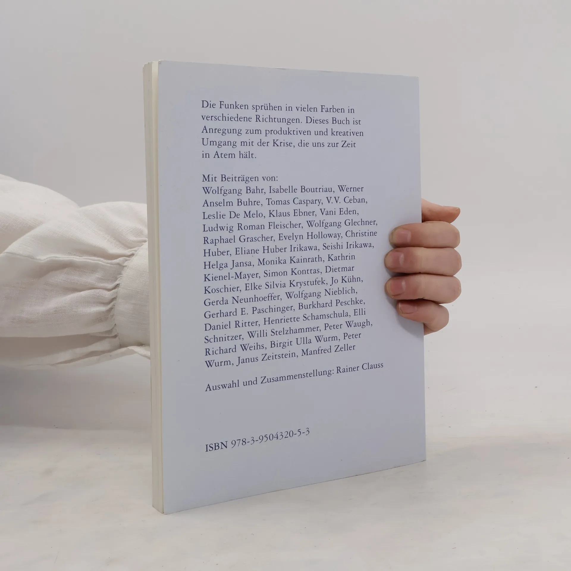 Die Funken sprühen in vielen Farben in verschiedene Richtungen. Dieses Buch ist Anregung zum produktiven und kreativen Umgang mit der Krise, die uns zur Zeit in Atem hält. Mit Beiträgen von: Wolfgang Bahr, Isabelle Boutriau, Werner Anselm Buhre, Tomas Caspary, V.V. Ceban, Leslie De Melo, Klaus Ebner, Vani Eden, Ludwig Roman Fleischer, Wolfgang Glechner, Raphael Grascher, Evelyn Holloway, Christine Huber, Eliane Huber Irikawa, Seishi Irikawa, Helga Jansa, Monika Kainrath, Kathrin Kienel-Mayer, Simon Konttas, Dietmar Koschier, Elke Silvia Krystufek, Jo Kühn, Gerda Neunhoeffer, Wolfgang Nieblich, Gerhard E. Paschinger, Burkhard Peschke, Daniel Ritter, Henriette Schamschula, Elli Schnitzer, Willi Stelzhammer, Peter Waugh, Richard Weihs, Birgit Ulla Wurm, Peter Wurm, Janus Zeitstein, Manfred Zeller Auswahl und Zusammenstellung: Rainer Clauss