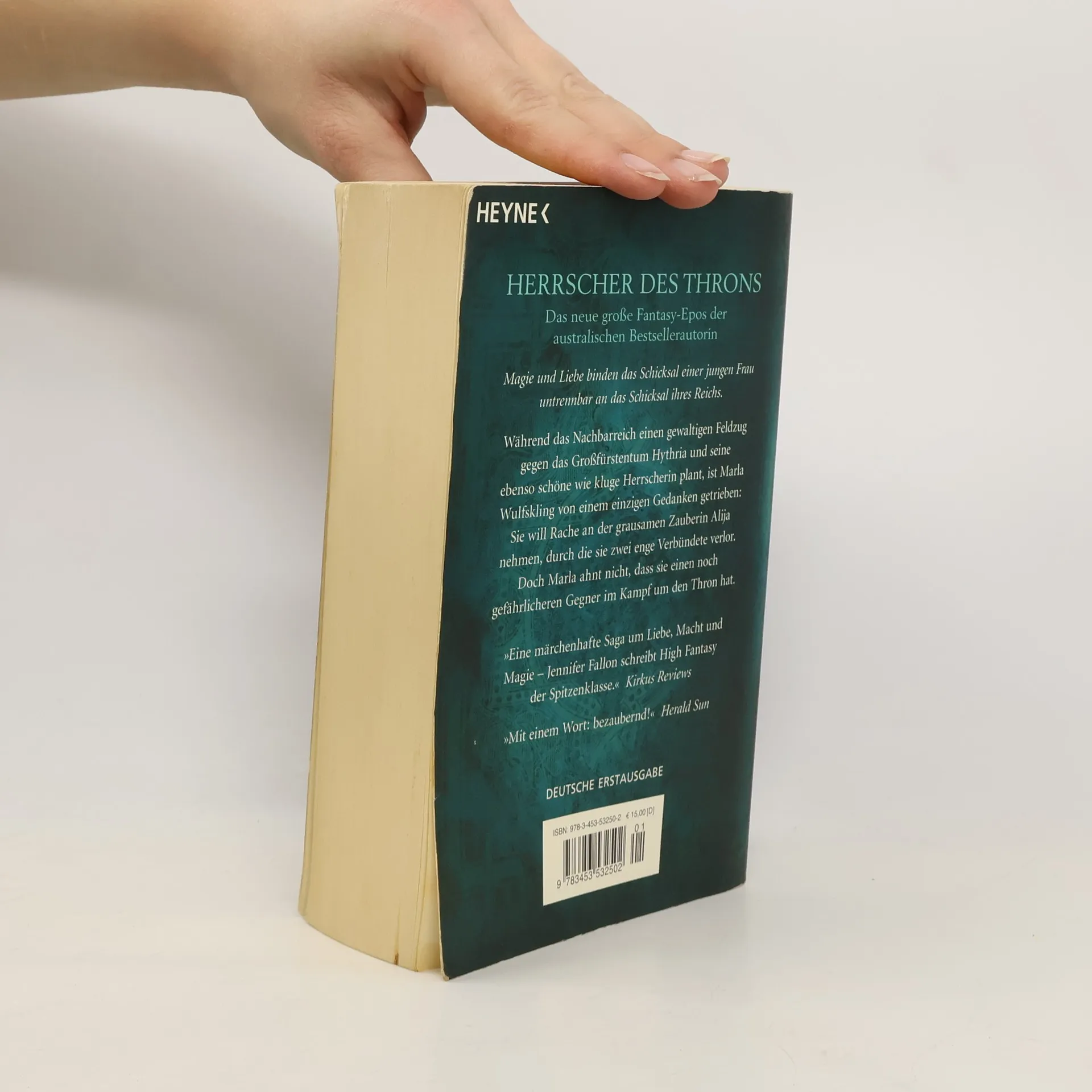 Magie, Macht und Freundschaft – märchenhafte Fantasy von der australischen Bestsellerautorin „Herrscher des Throns“ ist der atemberaubende Abschluss von Jennifer Fallons großer Trilogie um das Schicksal eines magischen Reichs: Marla Wolfblade will Rache an der grausamen Zauberin Alija nehmen, durch die sie zwei enge Verbündete verlor. Doch was die junge Herrscherin nicht ahnt: Sie hat einen noch gefährlicheren Gegner im Kampf um den Thron Hythrias …