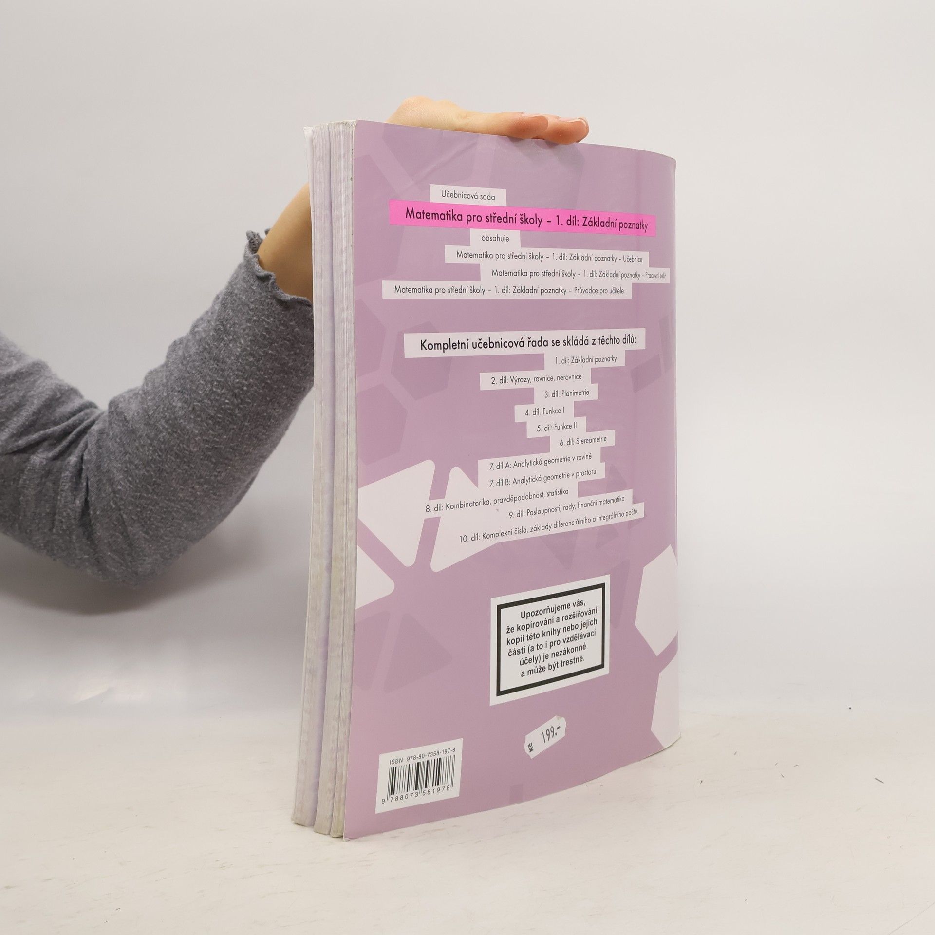 Přehledně, moderně a pro studenty přístupně zpracovaná učebnice vnáší nové možnosti do výuky matematiky na středních školách. Obsah první části zahrnuje základní poznatky o číselných oborech, výrokové logice a teorii množin. Učivo je srozumitelně a strukturovaně podáno ve výkladové části učebnice a je doplněno jednoduchými řešenými příklady.