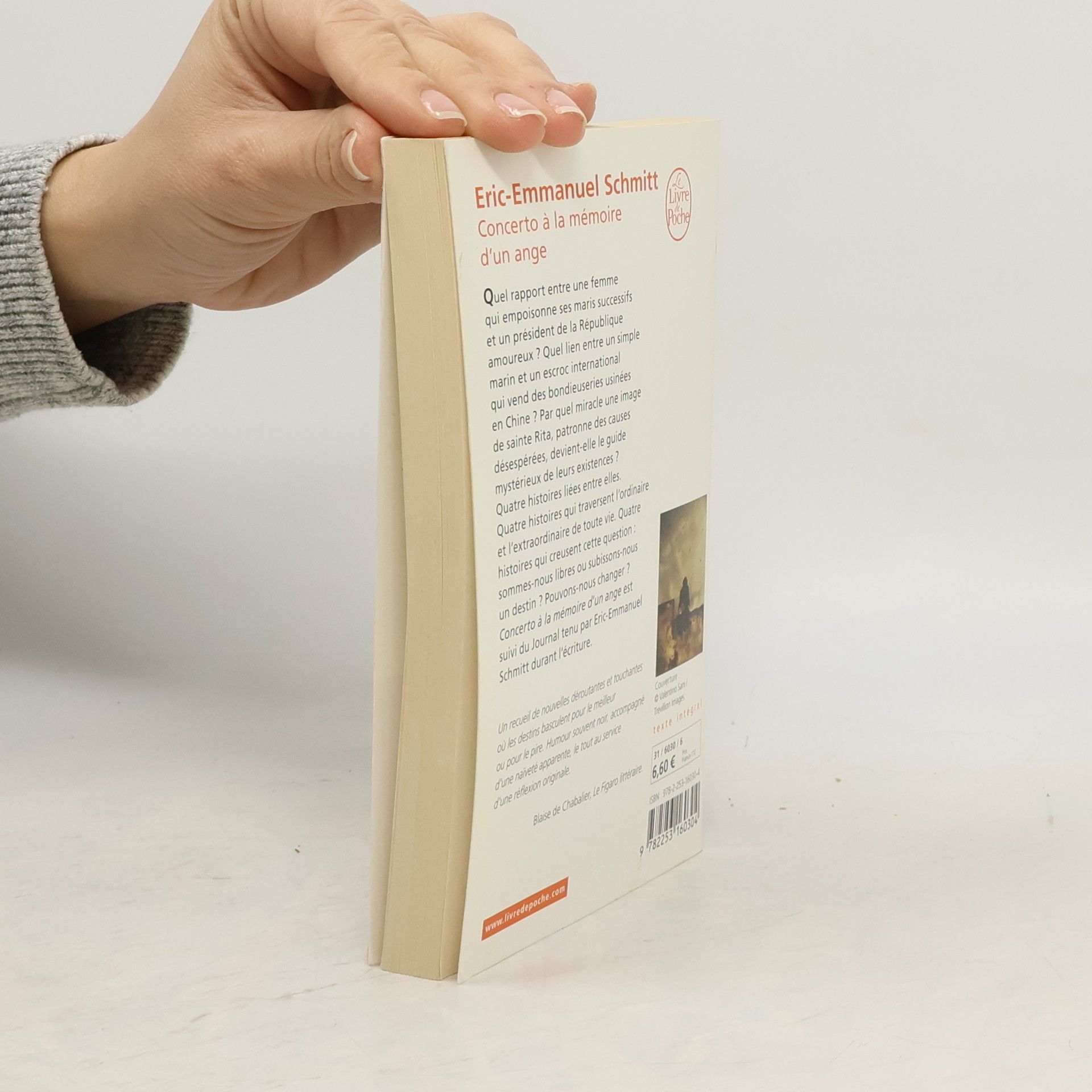 Quel rapport entre une femme qui empoisonne ses maris successifs et un président de la République amoureux ? Quel lien entre un simple marin et un escroc international qui vend des bondieuseries usinées en Chine ? Par quel miracle une image de sainte Rita, patronne des causes désespérées, devient-elle le guide mystérieux de leurs existences ? Quatre histoires liées entre elles. Quatre histoires qui traversent l'ordinaire et l'extraordinaire de toute vie. Quatre histoires qui creusent cette question : sommes-nous libres ou subissons-nous un destin ? Pouvons-nous changer ? Concerto à la mémoire d'un ange est suivi du Journal tenu par Eric-Emmanuel Schmitt durant l'écriture.
