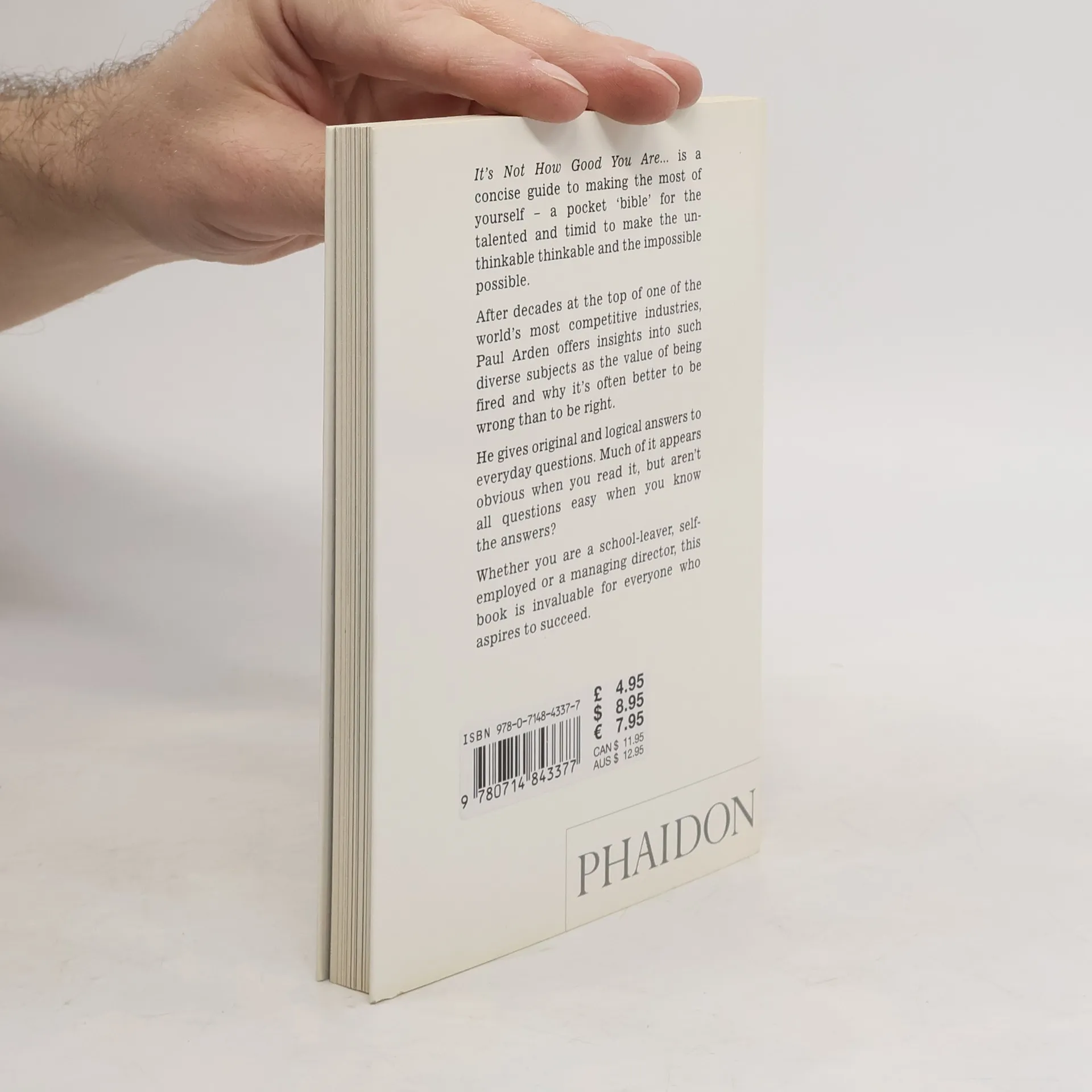 It’s Not How Good You Are, It’s How Good You Want to Be is a handbook of how to succeed in the world: a pocket bible for the talented and timid alike to help make the unthinkable thinkable and the impossible possible.The world’s top advertising guru, Paul Arden, offers up his wisdom on issues as diverse as problem solving, responding to a brief, communicating, playing your cards right, making mistakes, and creativity – all endeavors that can be applied to aspects of modern life.This uplifting and humorous little book provides a unique insight into the world of advertising and is a quirky compilation of quotes, facts, pictures, wit and wisdom – all packed into easy-to-digest, bite-sized spreads. If you want to succeed in life or business, this book is a must.
