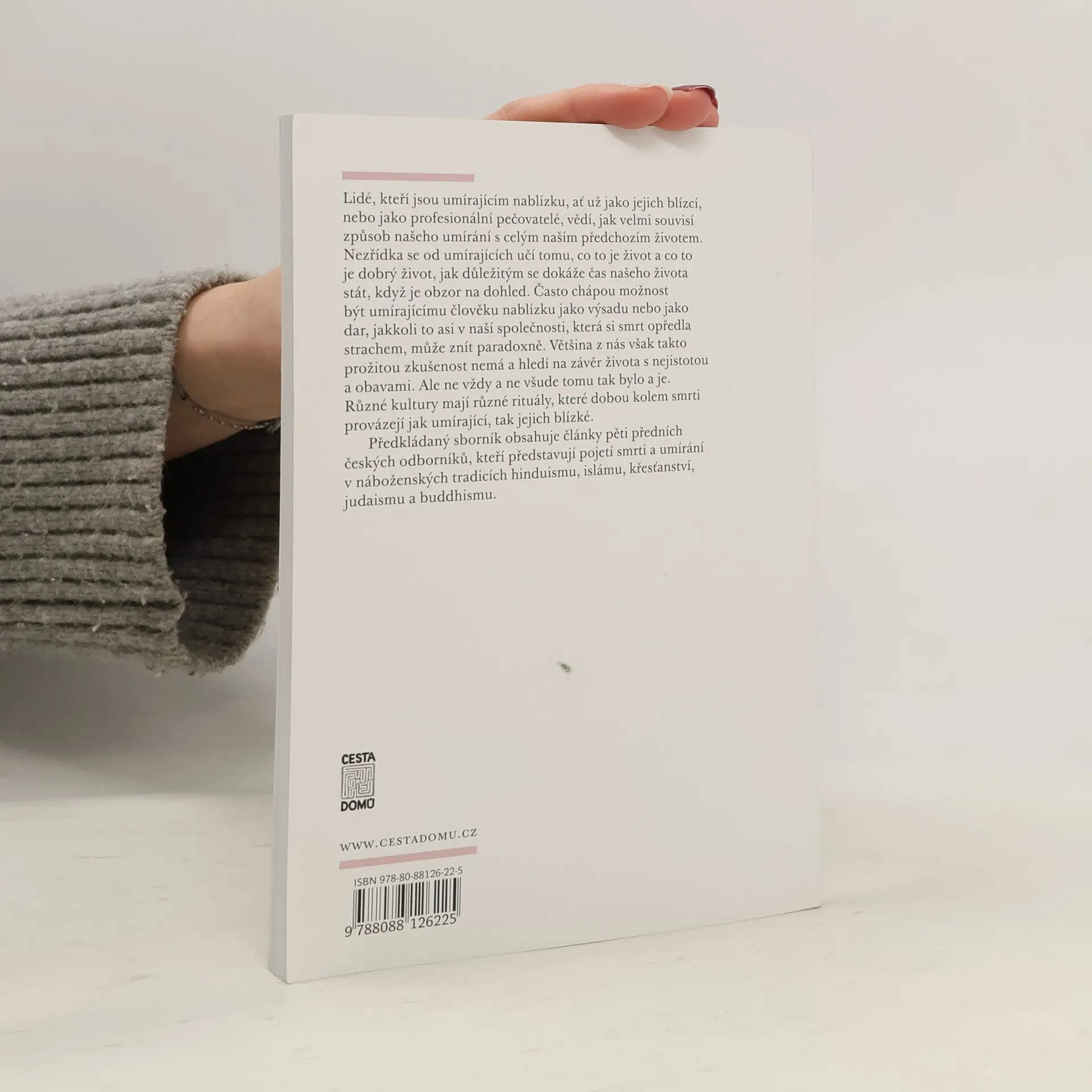 Sborník Smrt a umírání v náboženských tradicích současnosti obsahuje články pěti předních českých odborníků, kteří představují pojetí smrti a umírání v náboženských tradicích hinduismu, islámu, křesťanství, judaismu a buddhismu. Texty jsou písemně zpracované přednášky Lubomíra Ondračky, Luboše Kropáčka, Tomáše Halíka, Milana Lyčky a Marka Zemánka, které byly předneseny na přednáškovém cyklu Cesty domů v Městské knihovně v Praze na přelomu roku 2009 a 2010. Lidé, kteří jsou umírajícím nablízku, ať už jako jejich blízcí, nebo jako profesionální pečovatelé, vědí, jak velmi souvisí způsob našeho umírání s celým naším předchozím životem. Chápou, že část života, kterou nazýváme umíráním, je plnohodnotným životem. Nezřídka se od umírajících učí tomu, co to je život a co to je dobrý život, jak důležitým se dokáže čas našeho života stát, když je obzor na dohled. Často chápou možnost být umírajícímu člověku nablízku jako výsadu nebo jako dar, jakkoli to asi v naší společnosti, která si smrt opředla strachem, může znít paradoxně. Většina z nás však takto prožitou zkušenost nemá a hledí na závěr života s nejistotou a obavami. Autoři příspěvků Lubomír Ondračka: hinduismus Luboš Kropáček: islám Tomáš Halík: křesťanství Milan Lyčka: judaismus Marek Zemánek: buddhismus