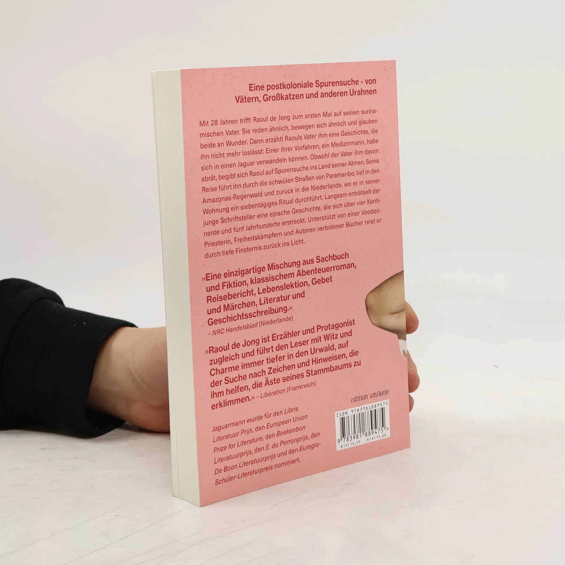 Mit 28 Jahren trifft Raoul de Jong zum ersten Mal auf seinen surinamischen Vater. Sie reden ähnlich, bewegen sich ähnlich und glauben beide an Wunder. Dann erzählt Raouls Vater ihm eine Geschichte, die ihn nicht mehr loslässt: Einer ihrer Vorfahren, ein Medizinmann, habe sich in einen Jaguar verwandeln können. Obwohl der Vater ihm davon abrät, begibt sich Raoul auf Spurensuche ins Land seiner Ahnen. Seine Reise führt ihn durch die schwülen Straßen von Paramaribo, tief in den Amazonas-Regenwald und zurück in die Niederlande, wo er in seiner Wohnung ein siebentägiges Ritual durchführt. Langsam enträtselt der junge Schriftsteller eine epische Geschichte, die sich über vier Kontinente und fünf Jahrhunderte erstreckt. Unterstützt von einer Voodoo-Priesterin, Freiheitskämpfern und Autoren verbotener Bücher reist er durch tiefe Finsternis zurück ins Licht.