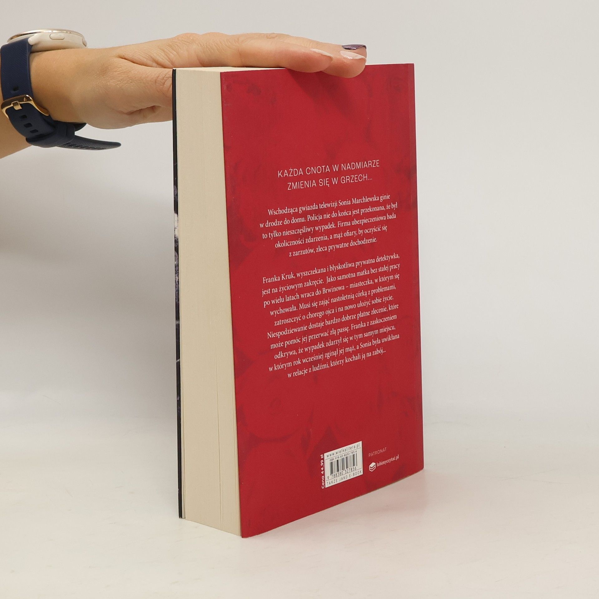 Każda cnota w nadmiarze zmienia się w grzech Wschodząca gwiazda telewizji Sonia Marchlewska ginie w drodze do domu. Policja nie do końca jest przekonana, że był to tylko nieszczęśliwy wypadek. Firma ubezpieczeniowa bada okoliczności zdarzenia, a mąż ofiary, by oczyścić się z zarzutów, zleca prywatne dochodzenie, Franka Kruk, wyszczekana i błyskotliwa prywatna detektywka, jest na życiowym zakręcie. Jako samotna matka bez stałej pracy po wielu latach wraca do Brwinowa - miasteczka, w którym się wychowała. Musi się zająć nastoletnią córką z problemami, zatroszczyć o chorego ojca i na nowo ułożyć sobie życie. Niespodziewanie dostaje bardzo dobrze płatne zlecenie, które może pomóc jej przerwać złą passę. Franka z zaskoczeniem odkrywa, że wypadek zdarzył się w tym samym miejscu, w którym rok wcześniej zginął jej mąż, a Sonia była uwikłana w relacje z ludźmi, którzy kochali ją aż na śmierć