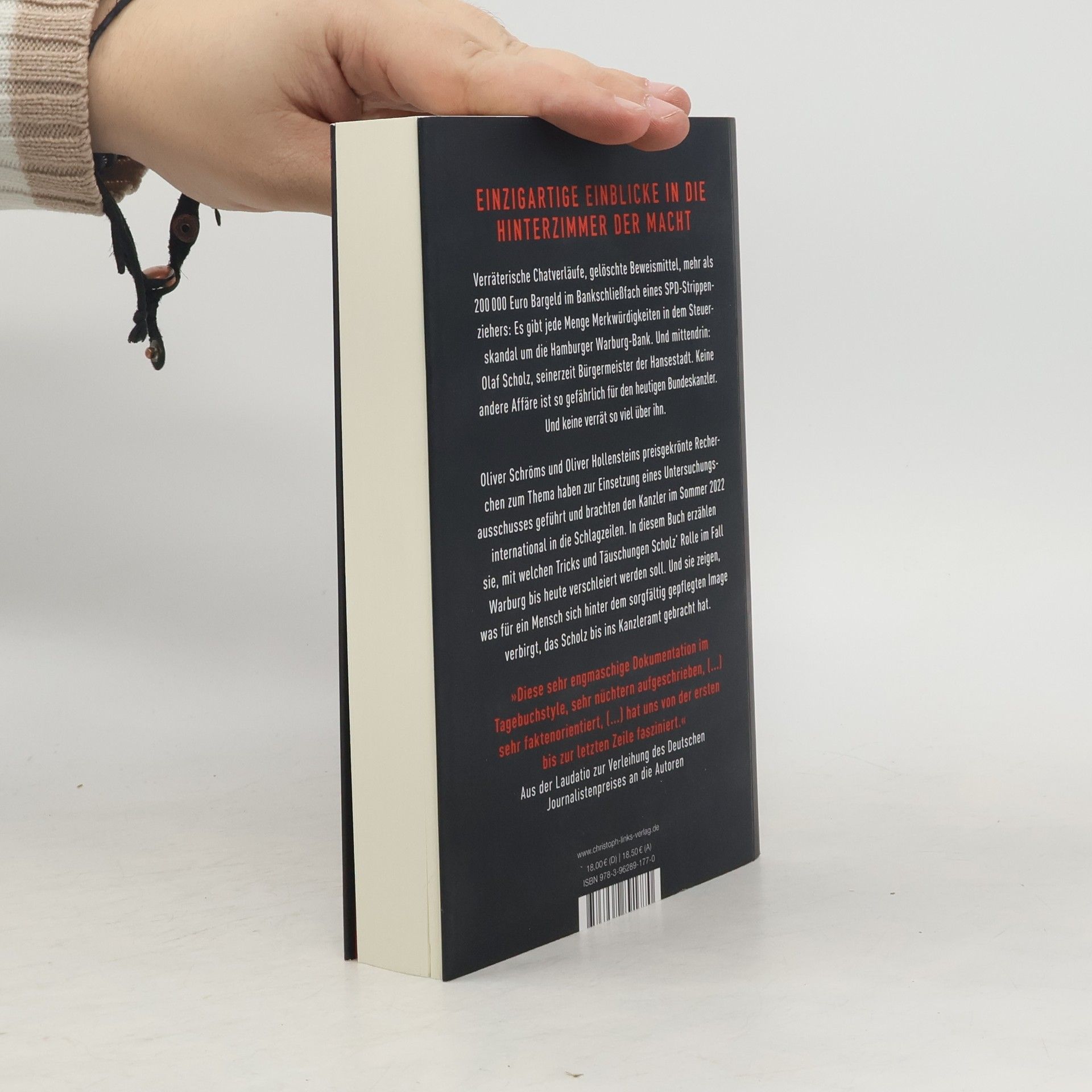 Einzigartige Einblicke in die Hinterzimmer der Macht Verräterische Chatverläufe, gelöschte Beweismittel, mehr als 200 000 Euro Bargeld im Bankschließfach eines SPD-Strippenziehers: Es gibt jede Menge Merkwürdigkeiten in dem Steuerskandal um die Hamburger Warburg-Bank. Und mittendrin: Olaf Scholz, seinerzeit Bürgermeister der Hansestadt. Keine andere Affäre ist so gefährlich für den heutigen Bundeskanzler. Und keine verrät so viel über ihn. Oliver Schröms und Oliver Hollensteins preisgekrönte Recherchen zum Thema haben zur Einsetzung eines Untersuchungsausschusses geführt und brachten den Kanzler im Sommer 2022 international in die Schlagzeilen. In diesem Buch erzählen sie, mit welchen Tricks und Täuschungen Scholz‘ Rolle im Fall Warburg bis heute verschleiert werden soll. Und sie zeigen, was für ein Mensch sich hinter dem Image verbirgt, das Scholz während seiner Karriere sorgfältig gepflegt hat – und das ihn bis ins Kanzleramt gebracht hat. »Diese sehr engmaschige Dokumentation im Tagebuchstyle, sehr nüchtern aufgeschrieben, (...) sehr faktenorientiert, (...) hat uns von der ersten bis zur letzten Zeile fasziniert.« Aus der Laudatio zur Verleihung des Deutschen Journalistenpreises an die Autoren